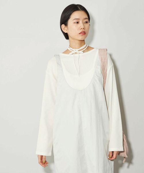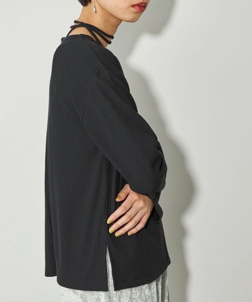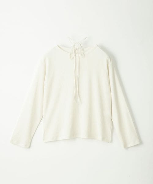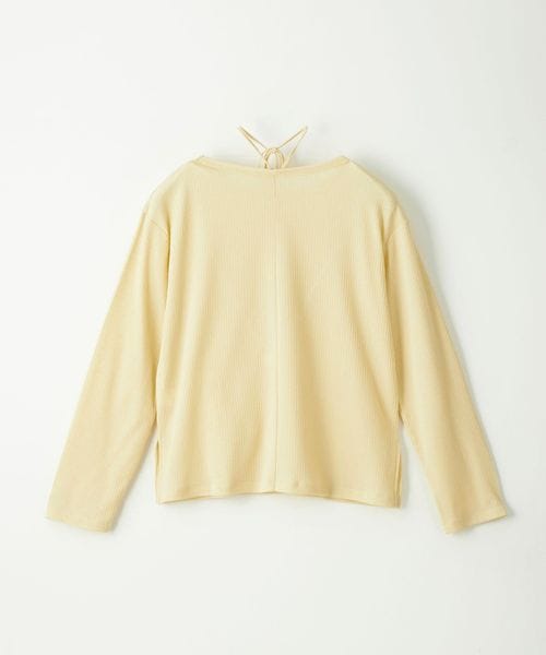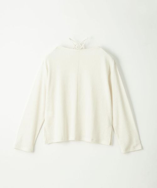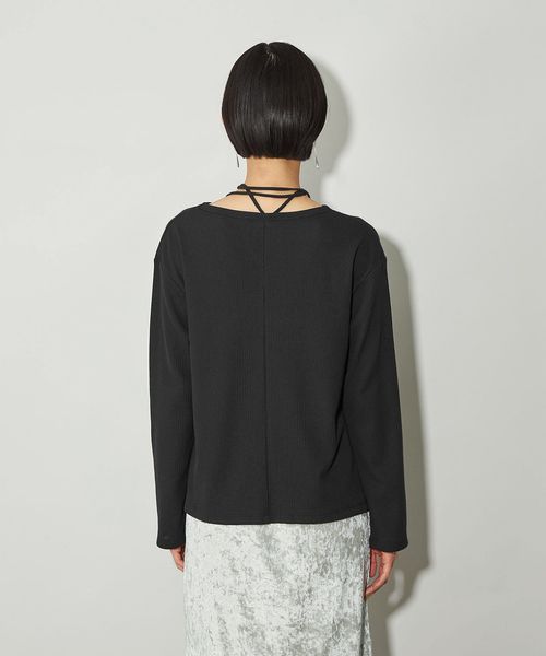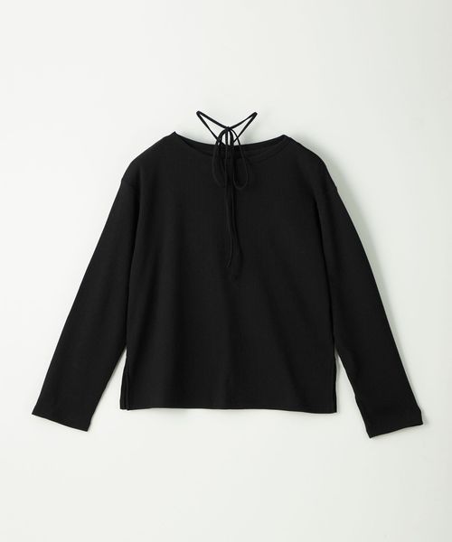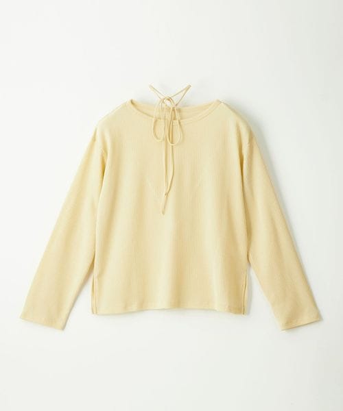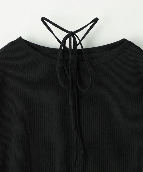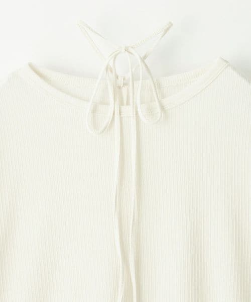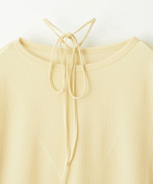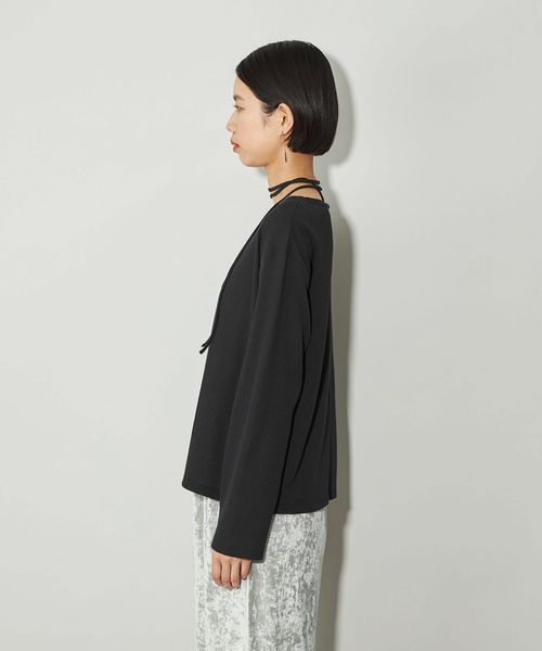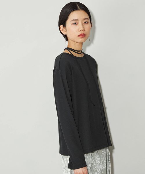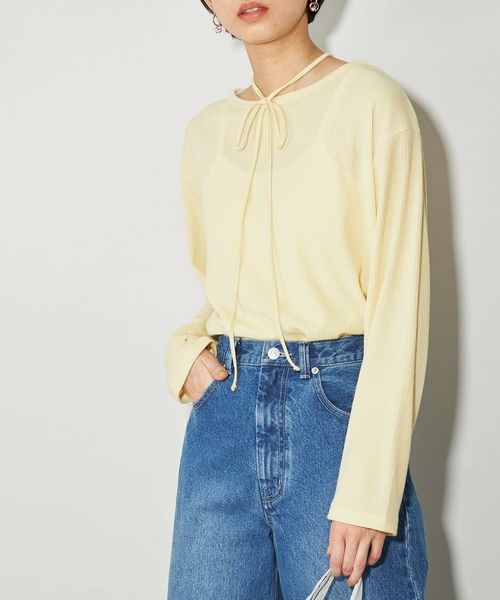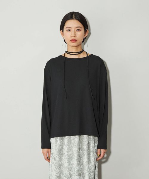 首元の紐デザインが特徴的でボートネックが程よい 肌見せで女性らしい印象のトップス。