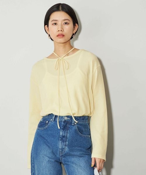 首元の紐デザインが特徴的でボートネックが程よい 肌見せで女性らしい印象のトップス。