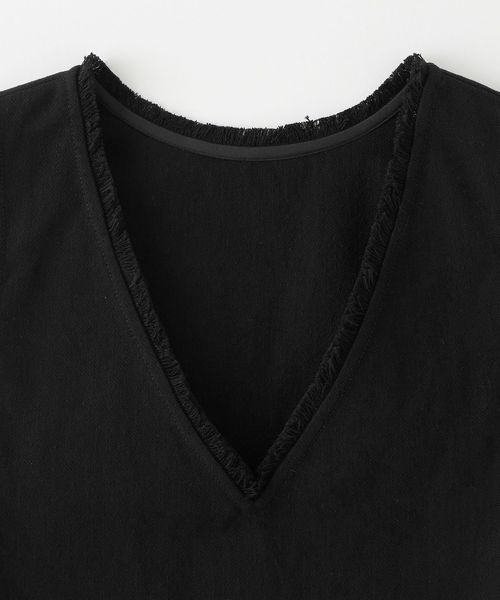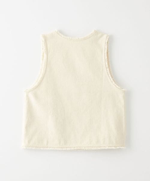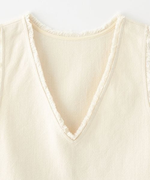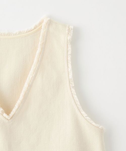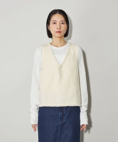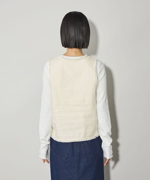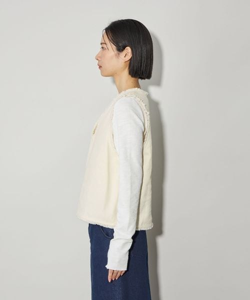 フリンジをあしらったデザインがポイントのベストは、華奢見えするように、肩の落ち方やサイドラインの位置などシルエットに拘って仕上げました。