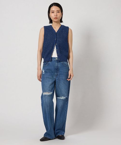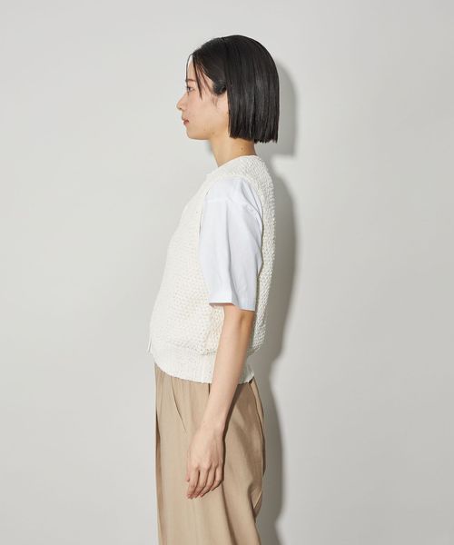デニムやスラックスはもちろん、スカートにも合わせやすく、ノースリーブニットトップスの感覚で自由にコーディネートをお楽しみいただけます。