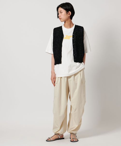 Tシャツの上にレイヤードしてコーディネートのアクセントになるベストは、一枚着のノースリーブとしても着用もおすすめ。