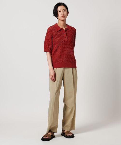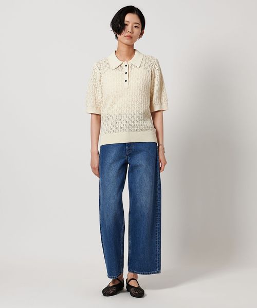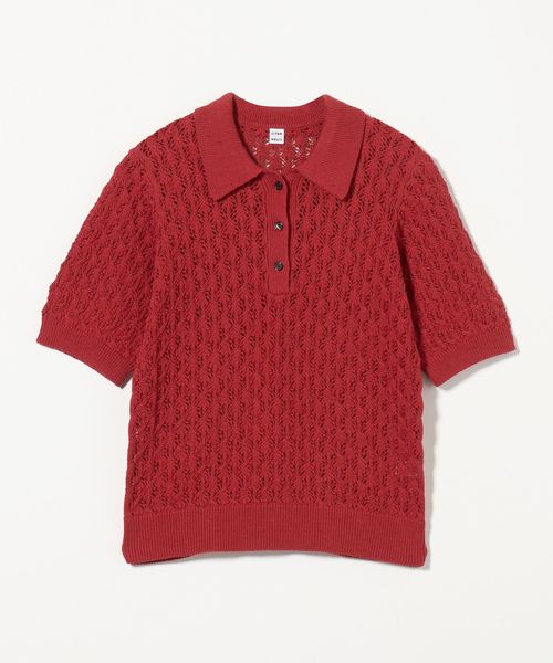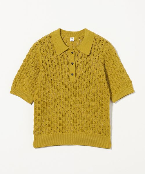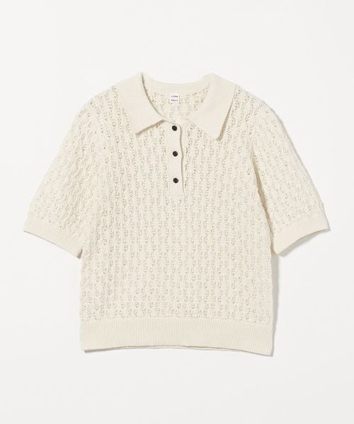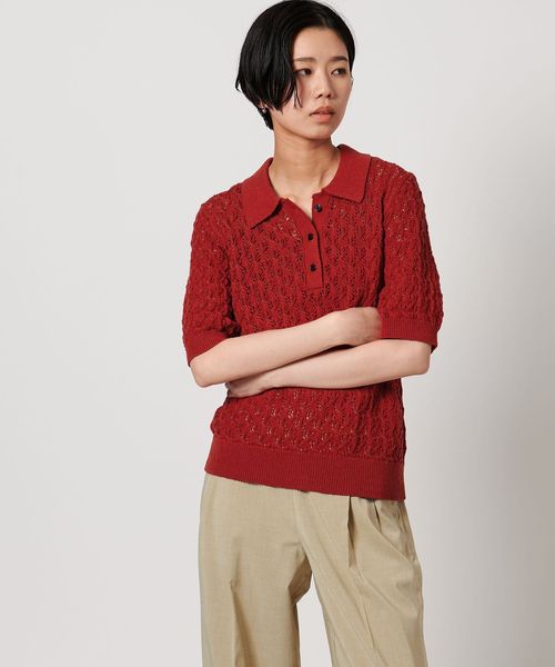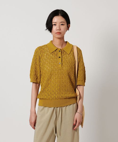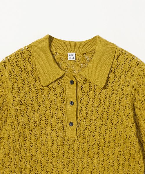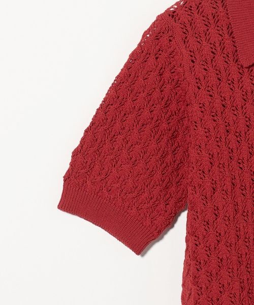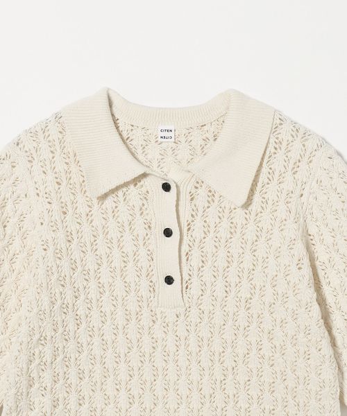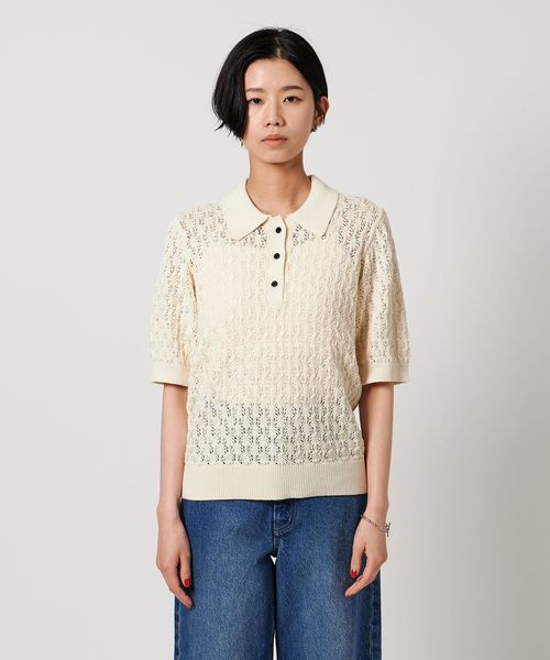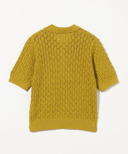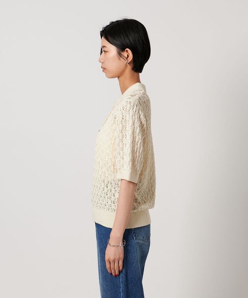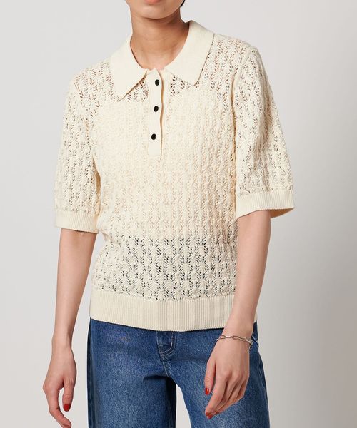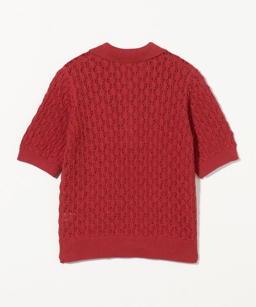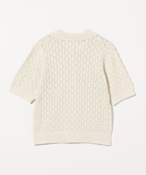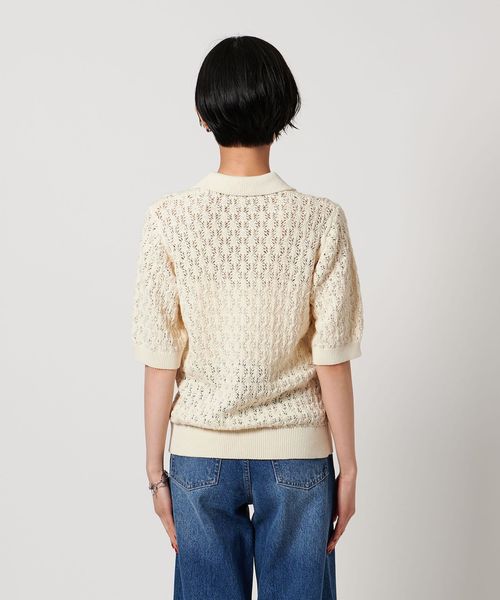 レースのような透かし編みが特徴の衿付きショートスリーブニット。