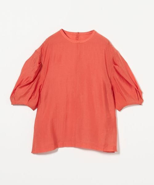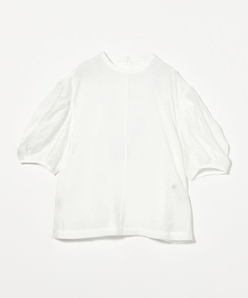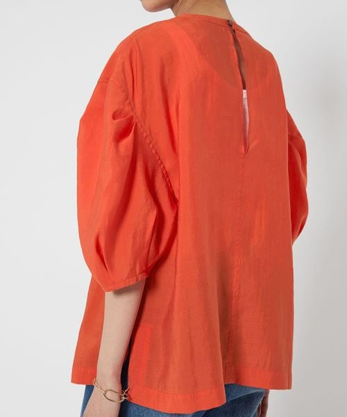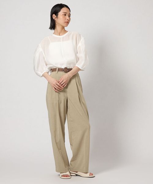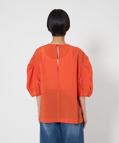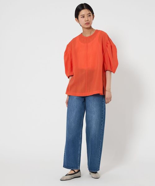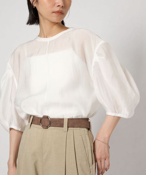 透けすぎないシアーで安心感のある素材を使用したブラウスは、立体的な袖のフォルムが特徴的でシンプルに見えながら、こなれた印象に。