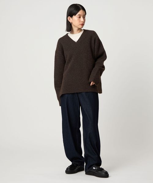 どんなスタイリングにも馴染む便利なベーシック系のニットは、一枚ではもちろん、インナーにロンTやタートル、シャツを合わせたスタイリングがおすすめです。