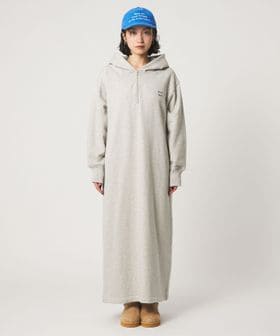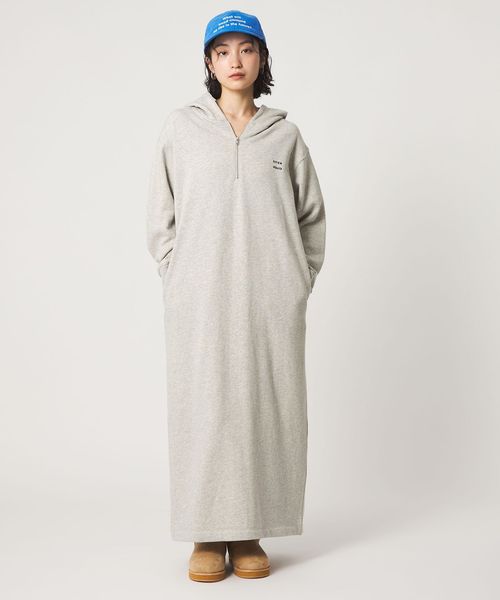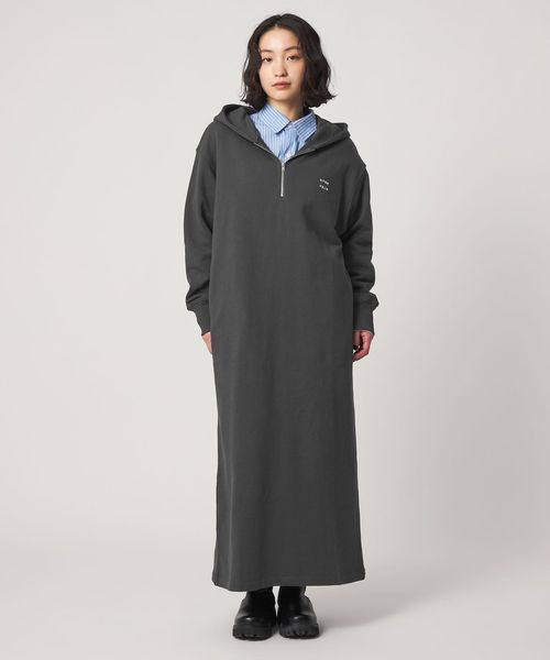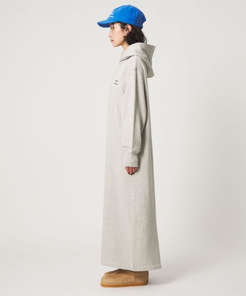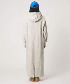 フード付きのスウェットワンピースをゆったりとしたシルエットと深めのスリットで軽い印象に仕上げた一枚。