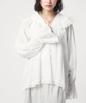 身生地にもドットの織り柄が施され、付属のレースもたっぷり使ったレースブラウス。