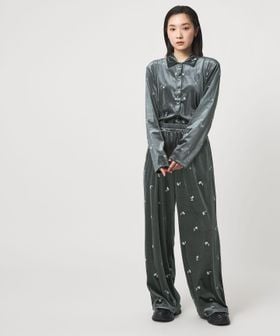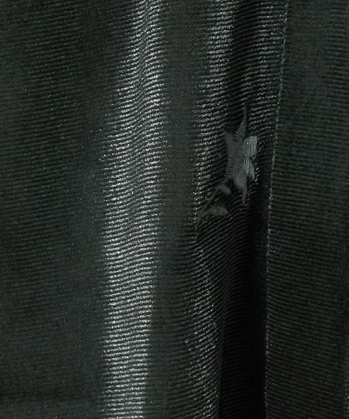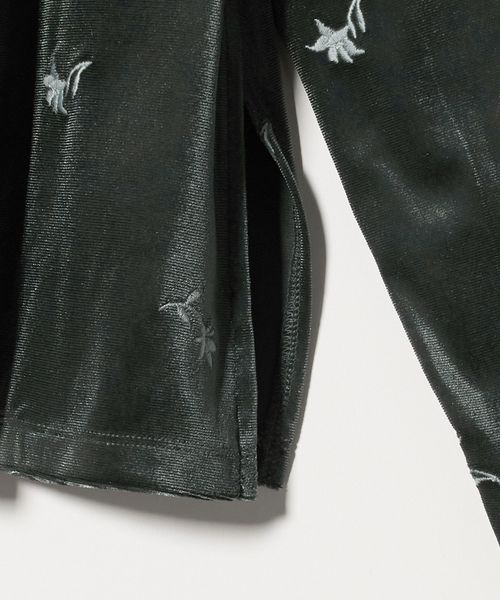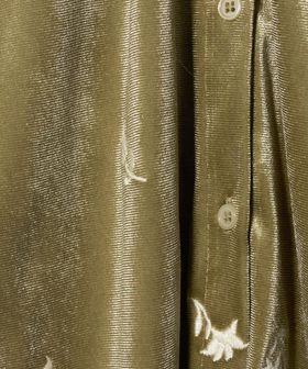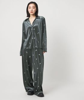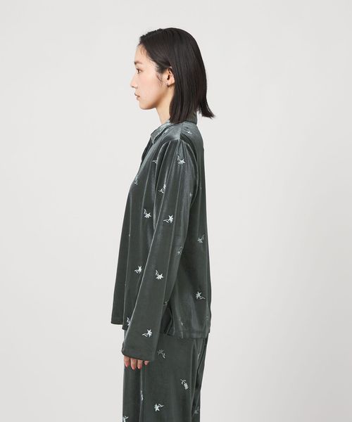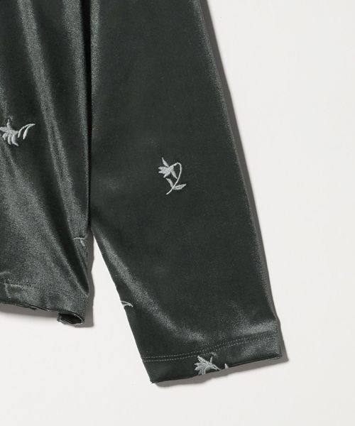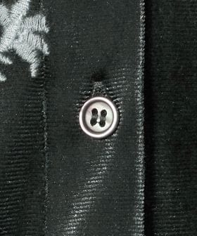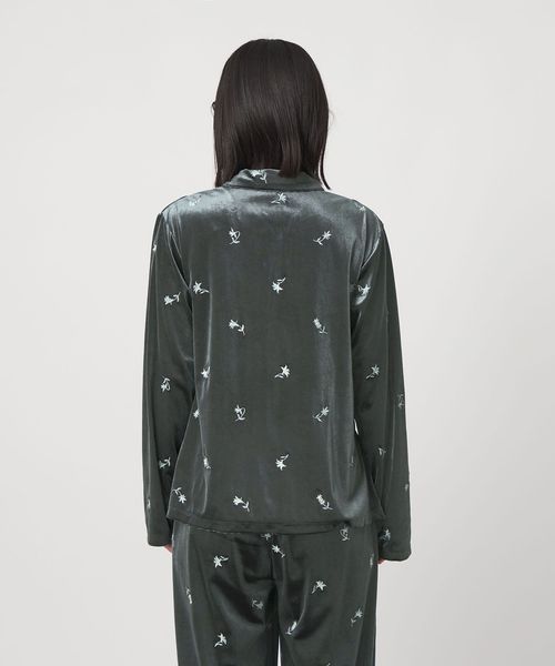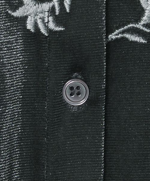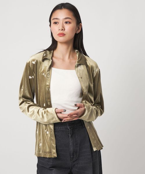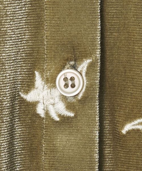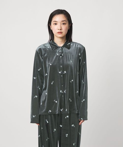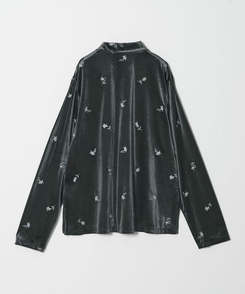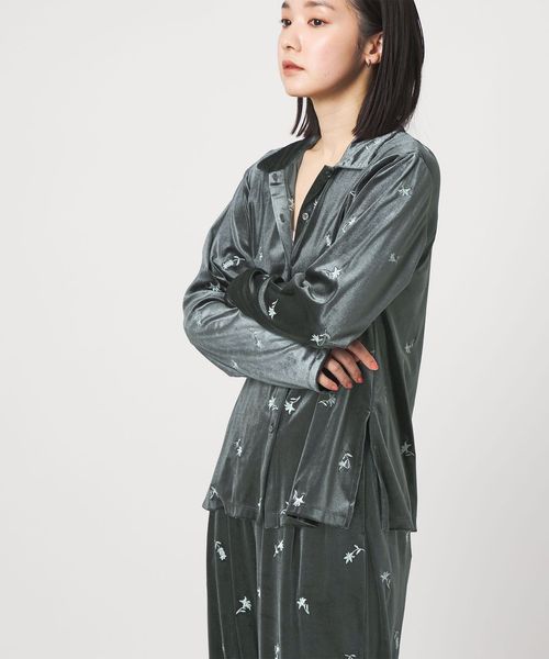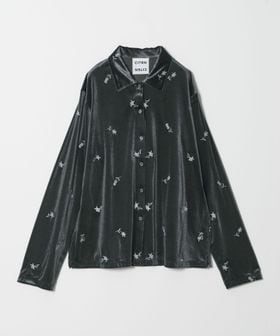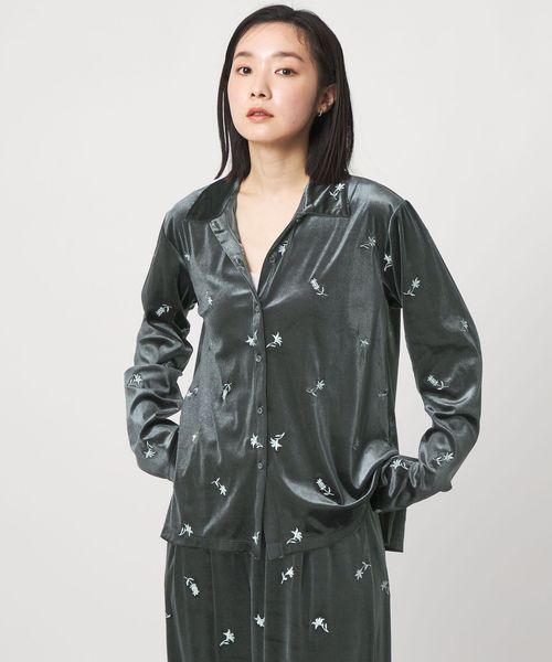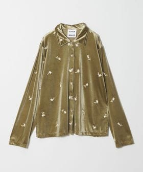 全体に散りばめた刺繍がポイント。きちんと感もありながらリラックスムードも漂うベロアシャツ