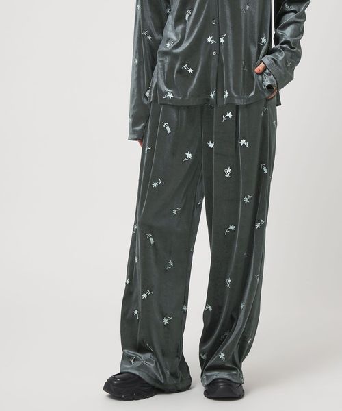 全体に散りばめた刺繍がポイント。リラックスムード漂うベロアパンツ