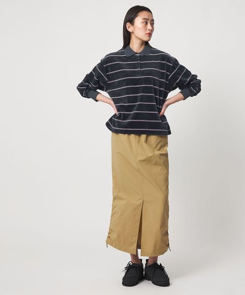 ゆとりのあるシルエットのポロシャツは、ベロア素材を使用し新鮮な見え感に。