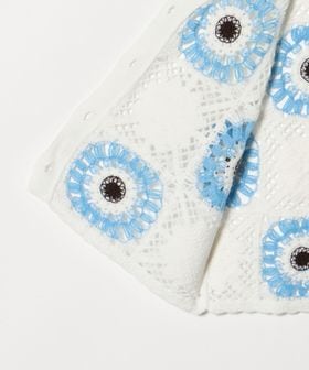 夏のレイヤードスタイルを華やかにしてくれる一品は、カラフルなレース柄が印象的です。