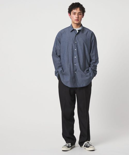 さらっと着れる羽織りシャツとしても、ボタンをすべて締めてスラックスにタックインしても今風なスタイリングに落とし込むことが出来きます。