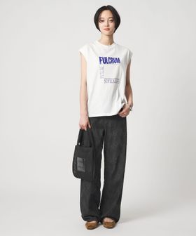 デニム素材にレーザー加工で模様を施し、従来のダメージ加工とは異なる表情を持たせています。