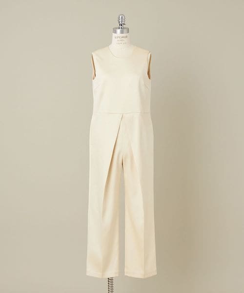 ウエストタックのボリュームが目を引くノースリーブオールインワン。