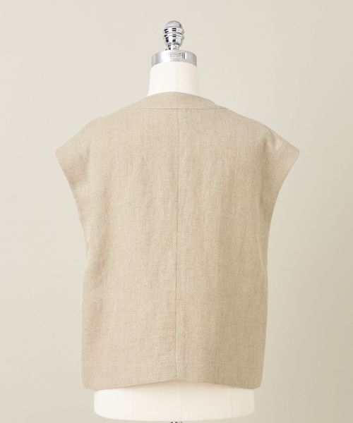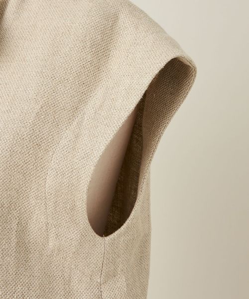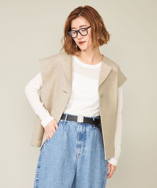 麻シルク素材の表情と大きめ1ボタンが特徴のリラックス感漂うノースリーブジレ。
