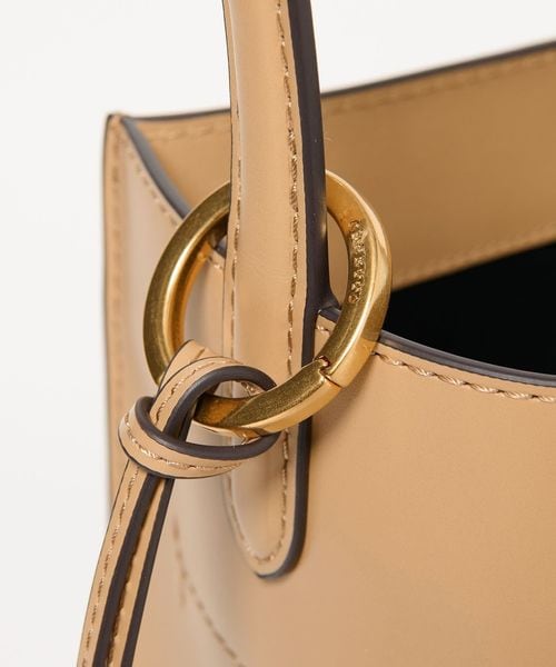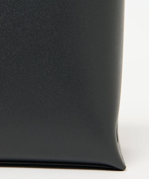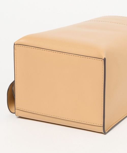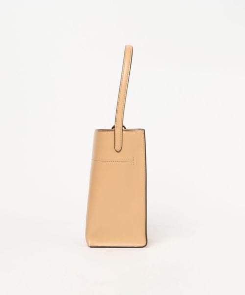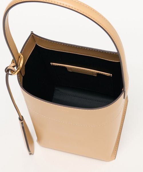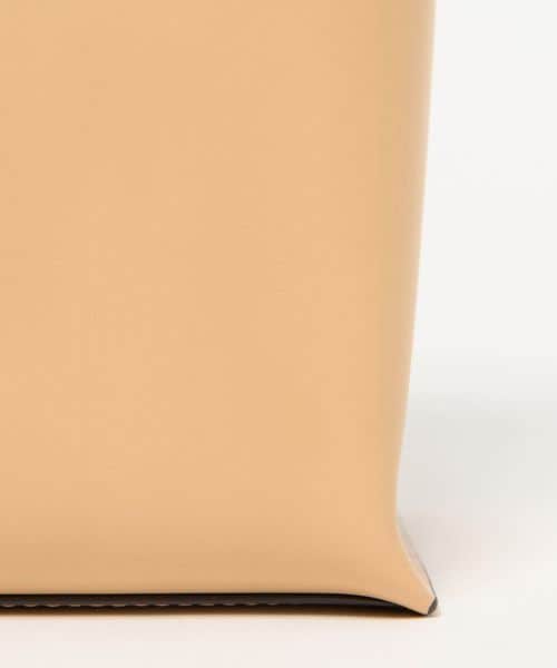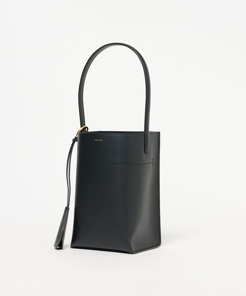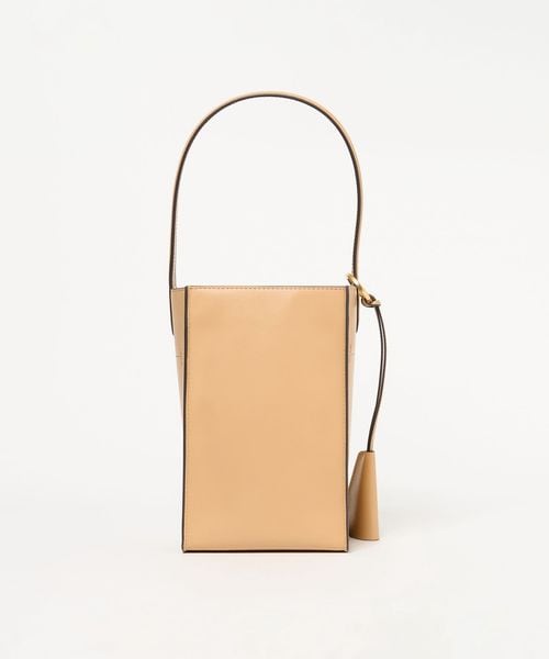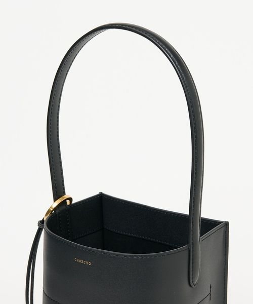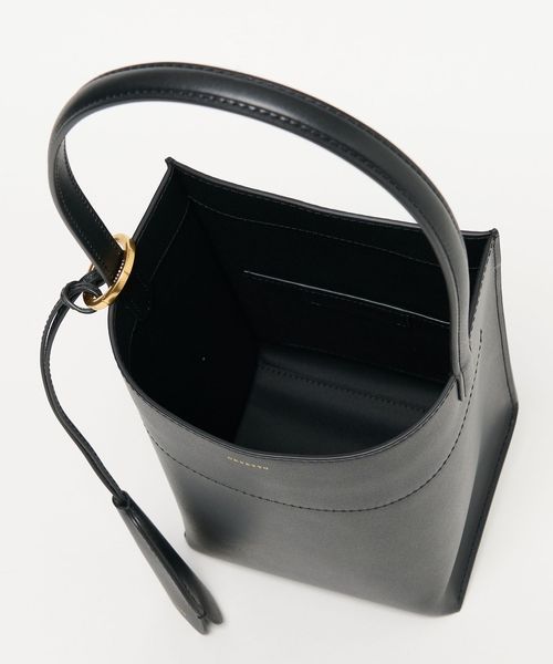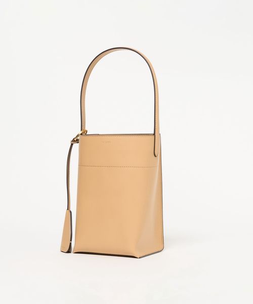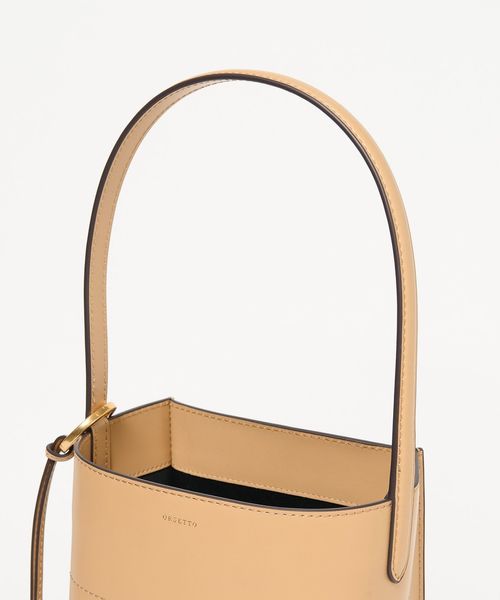 なめらかな表面のスムースレザーを使用したスクエアなタテ長シルエットが新鮮なバケツバッグ。
