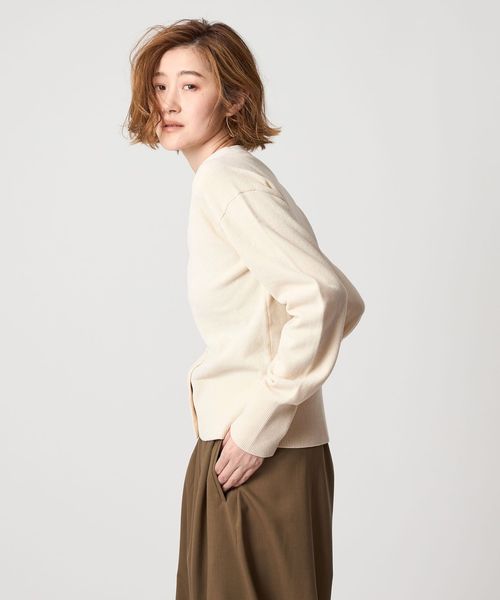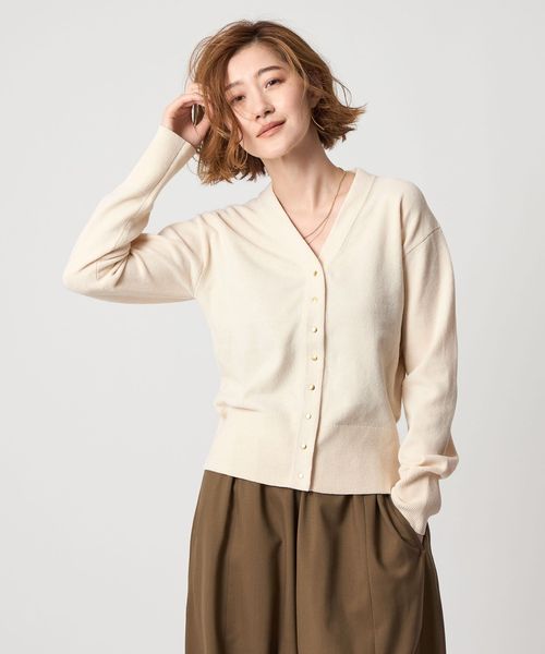 メタルボタンがアクセントのVネックカーディガン。