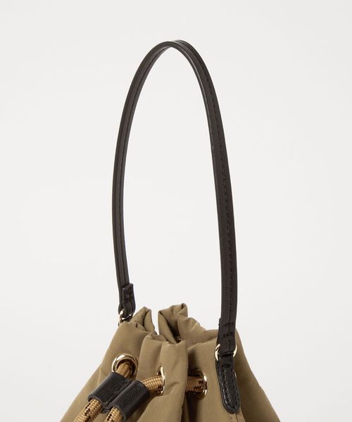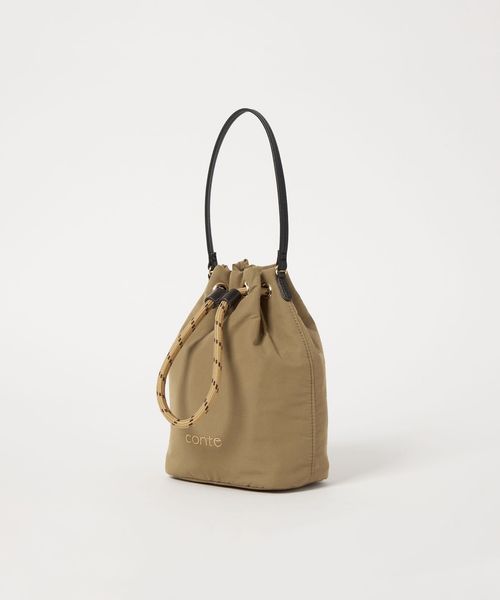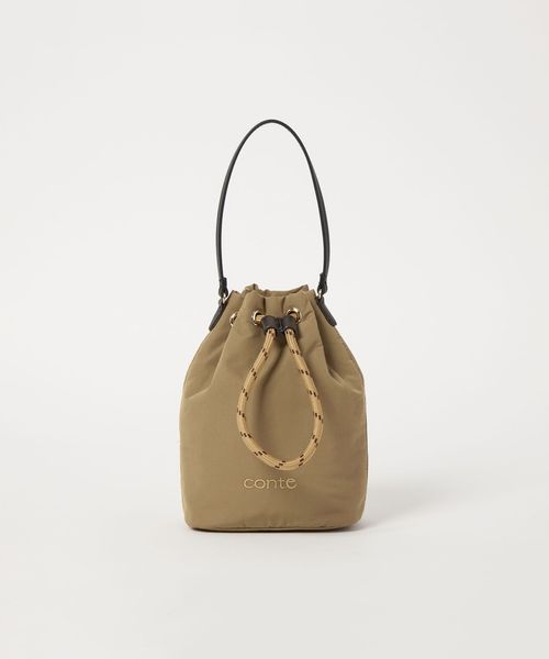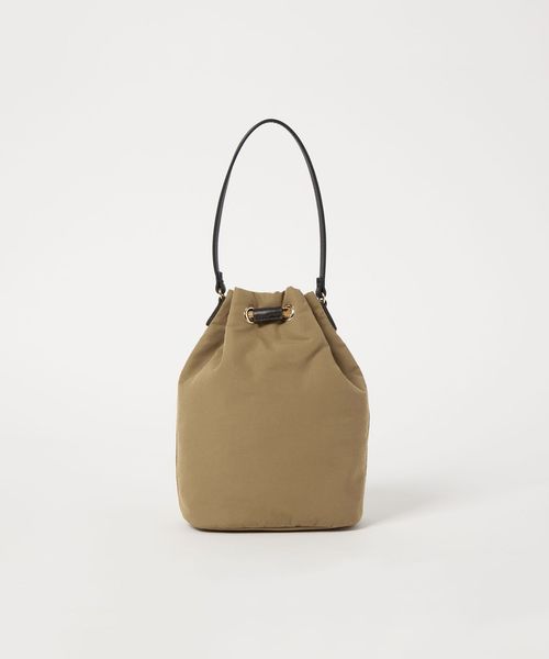 昨年ご好評いただいたミリタリートレンチコートと同素材を使用したベージュカラーの巾着バッグ。