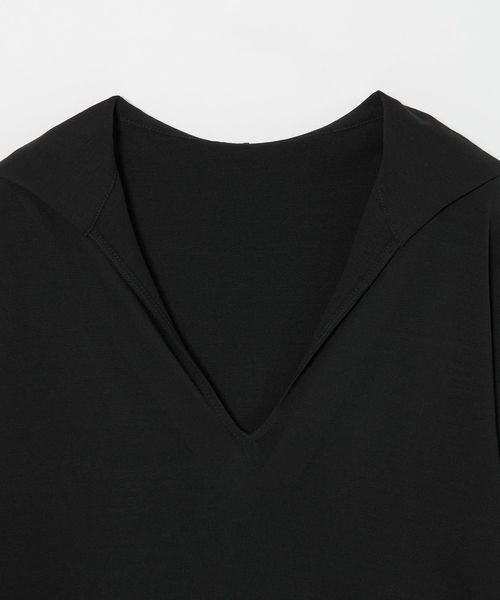 フード部分を二重にして少し厚みをもたせ、首元はVネックでフェミニンさもあるフーデッドプルオーバー。