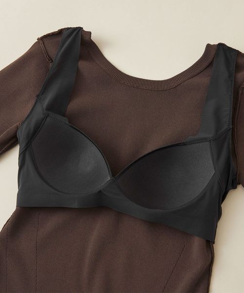 着心地や、女性を輝かせるデザイン性を持つニットウェアと、高度な技術力を持つ下着製造メーカーにより専用開発されたエアリーな着け心地のブラカップ。