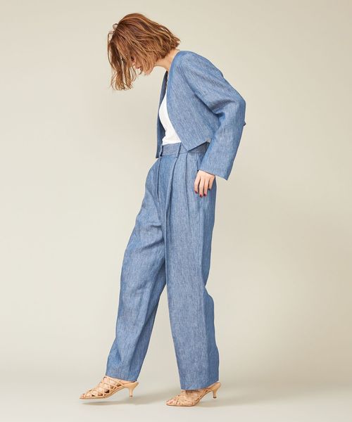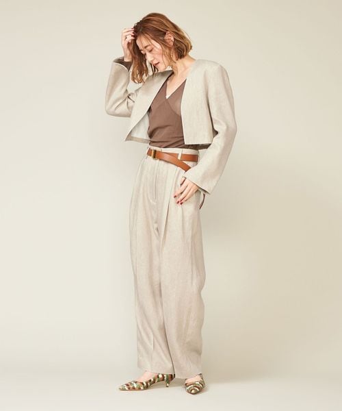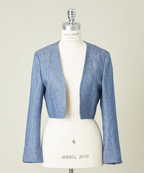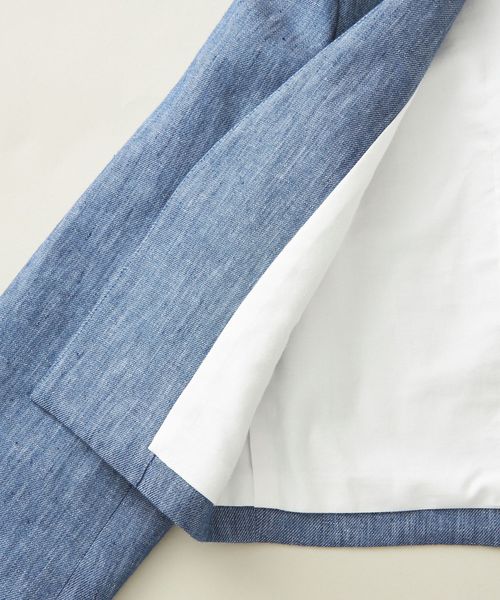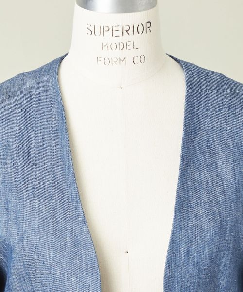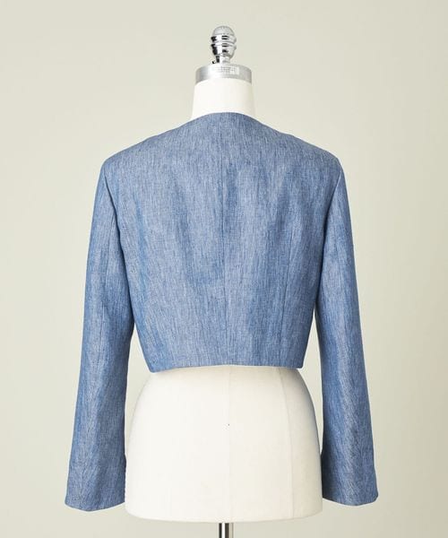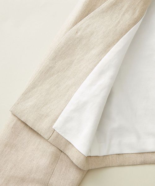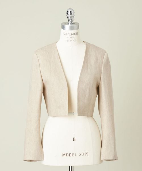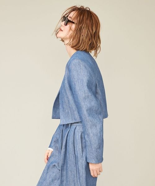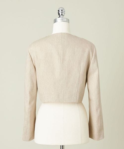 麻のナチュラルな表情が素敵なショート丈のノーカラージャケット。