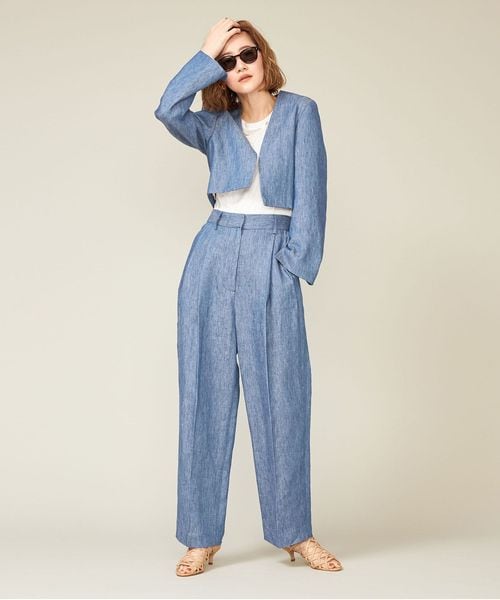 コンパクトなジャケットは同素材のパンツとのセットアップはもちろん、スカートやワンピースにさらりと羽織っても様になるアイテムです。