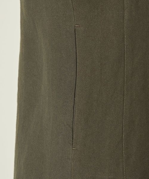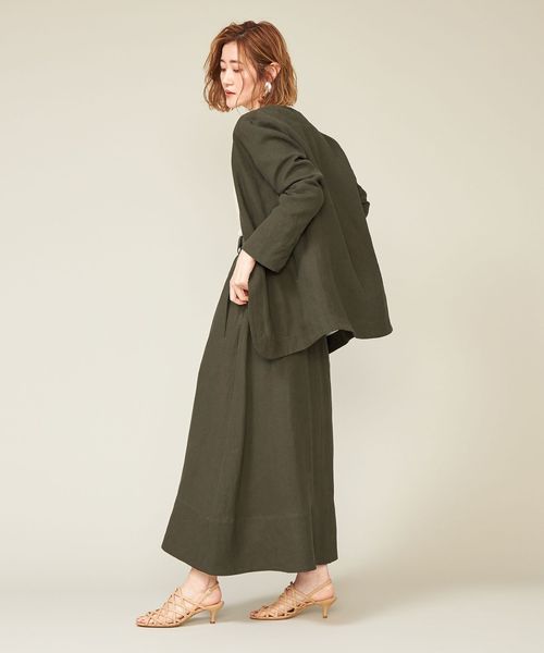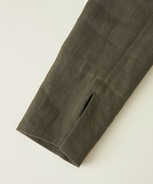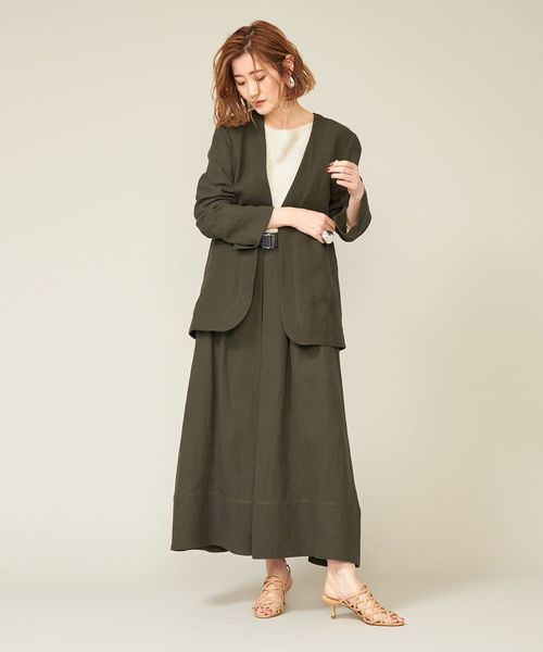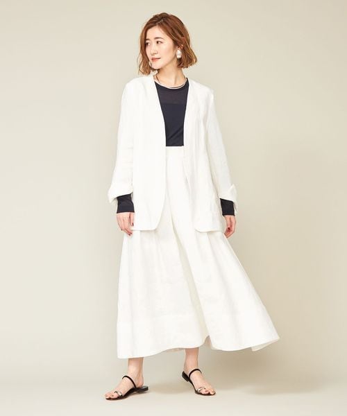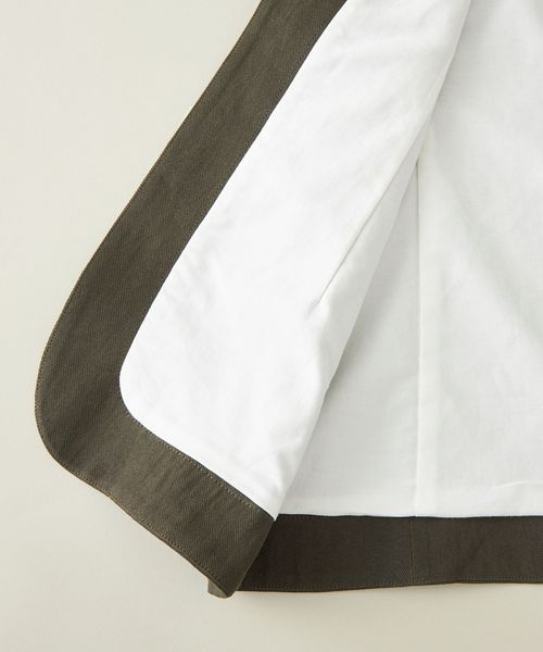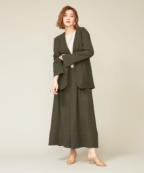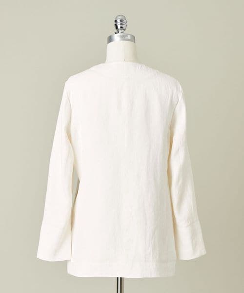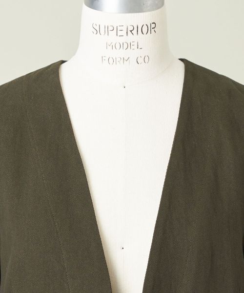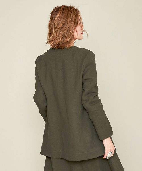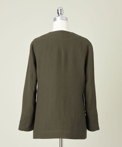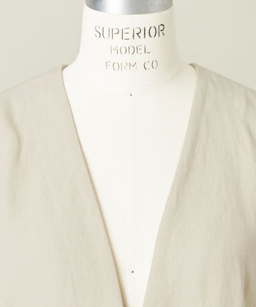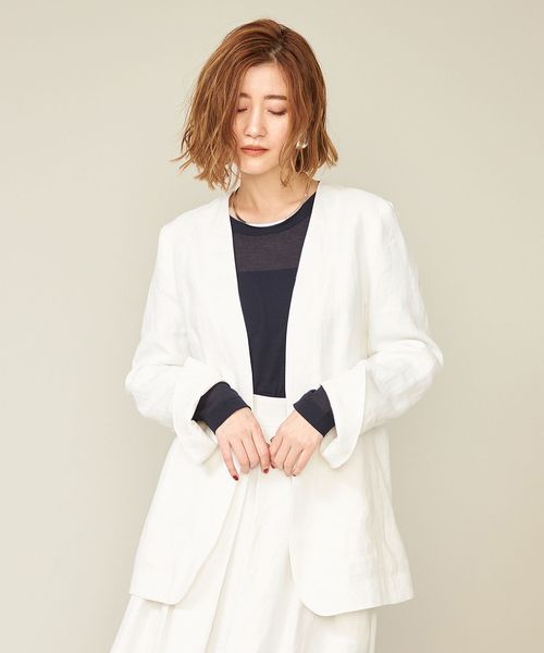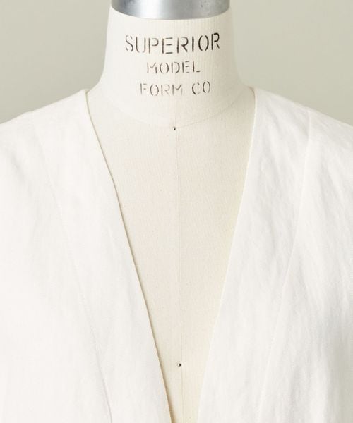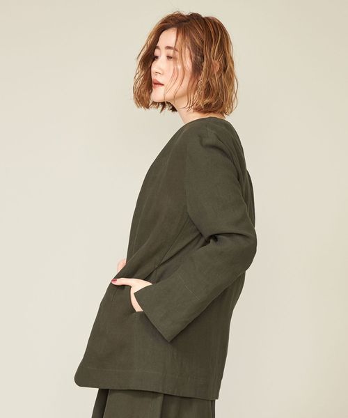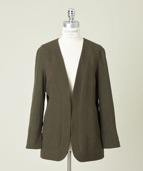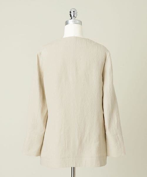 ノーボタン、袖口にスリットを施した堅苦しさのない雰囲気に仕上げたシンプルなノーカラージャケットです。