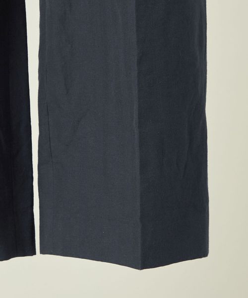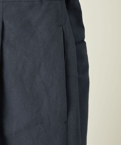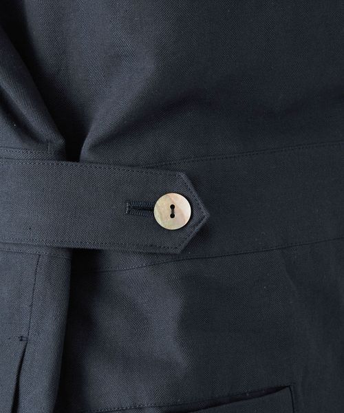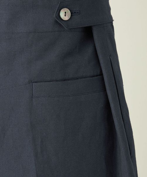 サイドのウエストボタンはサイズ調整が可能で、腰周りにすっきりとした印象を与えます。