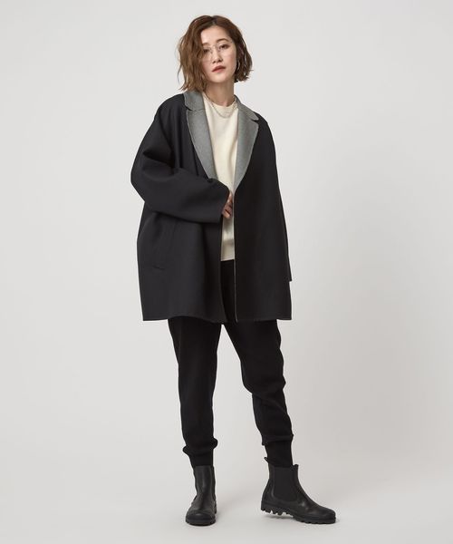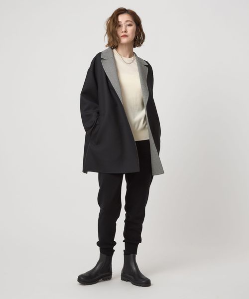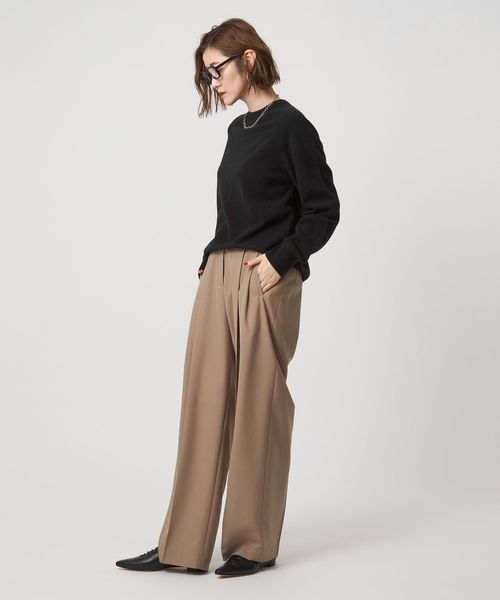 エリのリブを細く華奢に、裾をラウンドラインで仕上げることでフェミニンなティテールを加えています。