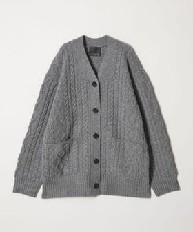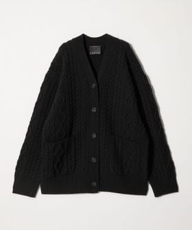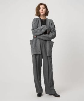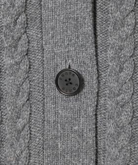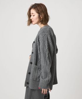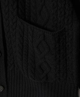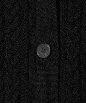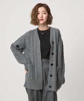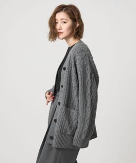 長めの着丈と浅めのVネックが特徴のケーブル柄カーディガン。