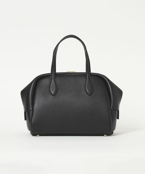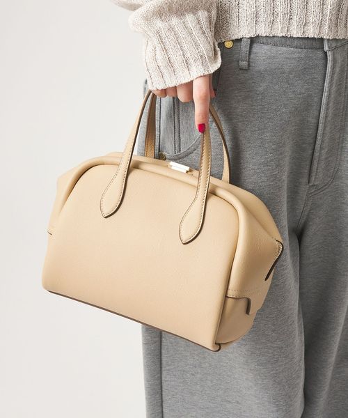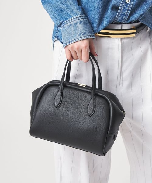 間口の幅を留め具で絞れるデザインの別注ハンドバッグ。