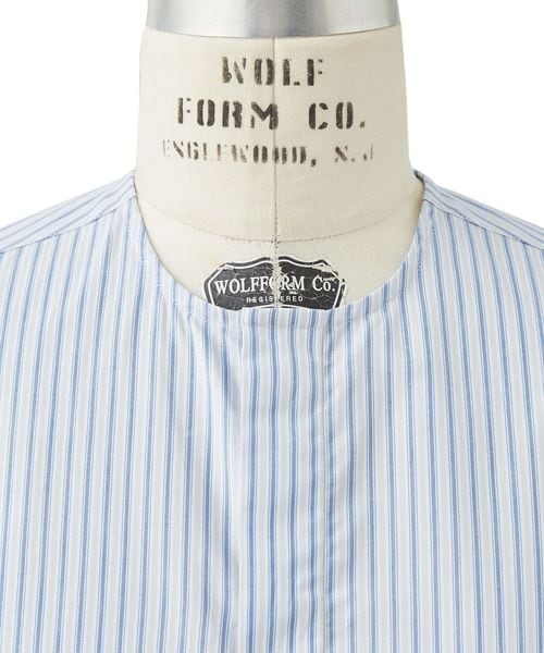 やわらかな雰囲気を演出するノーカラーデザインとすっきりめなボディで仕上げたロングスリーブシャツ。