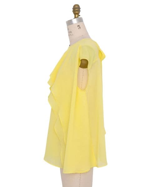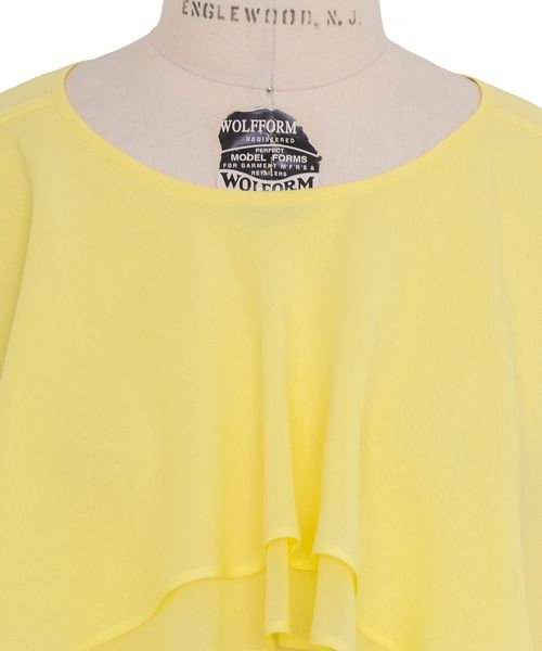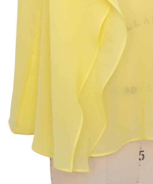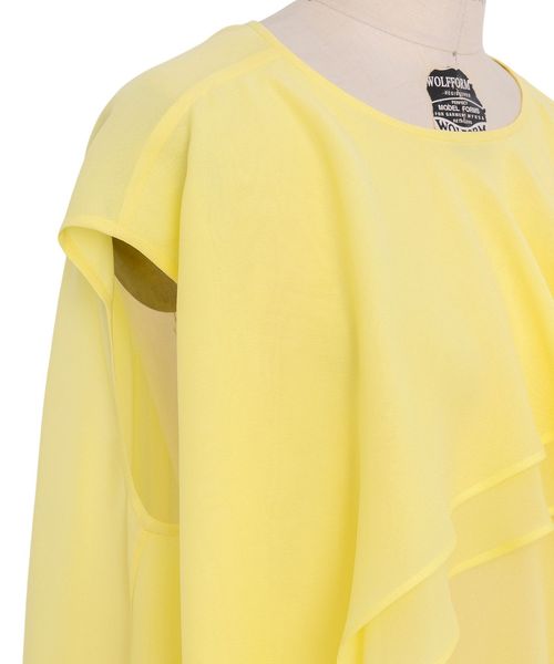 フロントは、ラッフル状のレイヤードデザイン、バックは、リボンがアクセントになった華のあるブラウス。