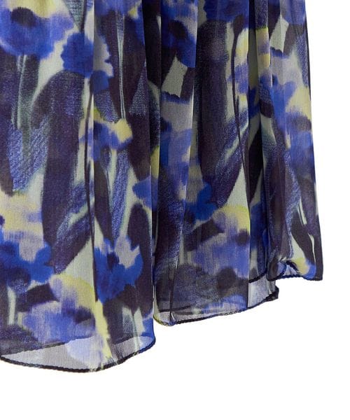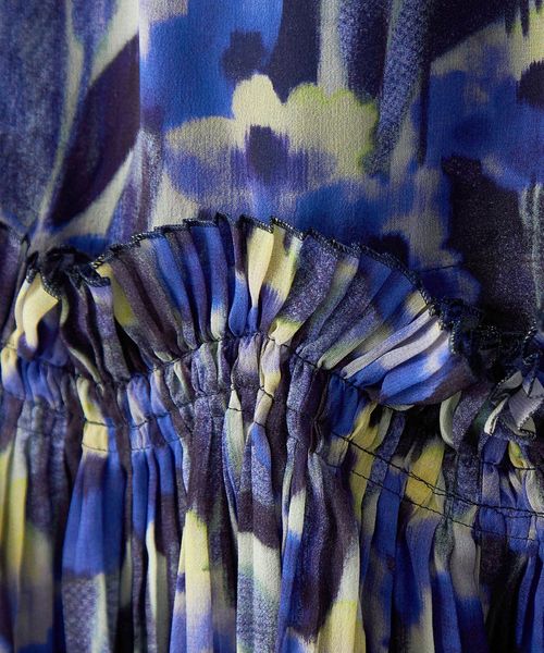 ブルーカラーのシルク素材にシアーなシルクプリント生地を重ねた幻想的な雰囲気が特徴です。