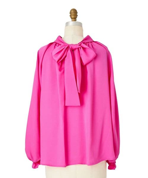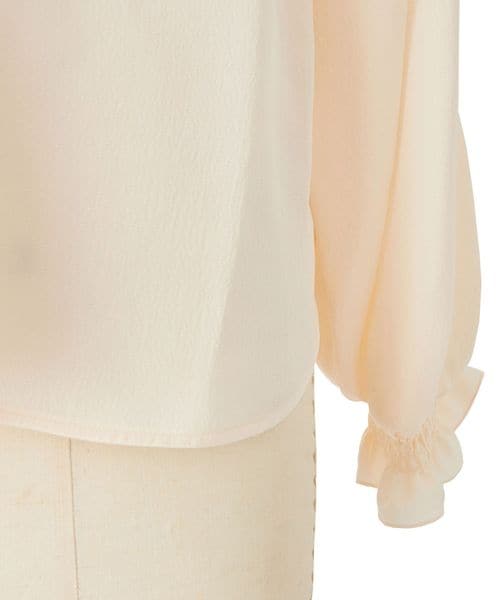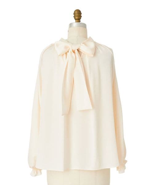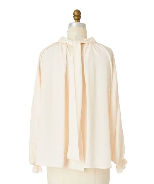 ロールネックから続くリボンタイを結ぶ位置で襟元の表情が変化するブラウス。