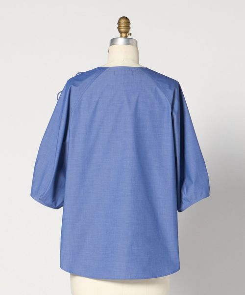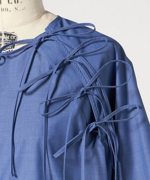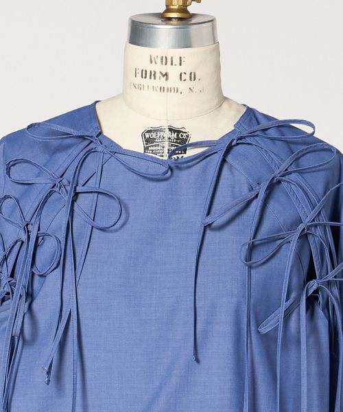 ショルダーにあしらったフリンジ状のリボンが特徴的なブラウス。