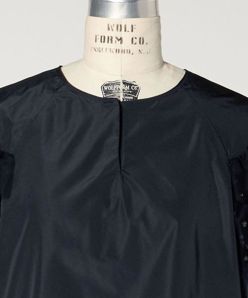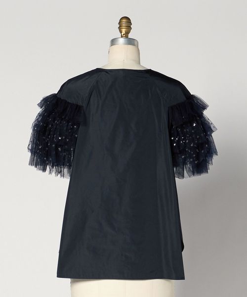 無地のチュールとスパンコール刺繍を施したチュールをレイヤードして仕立てたティアードスリーブブラウス。