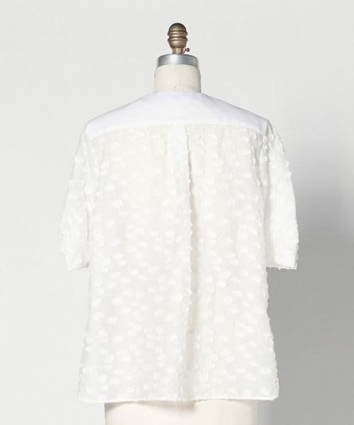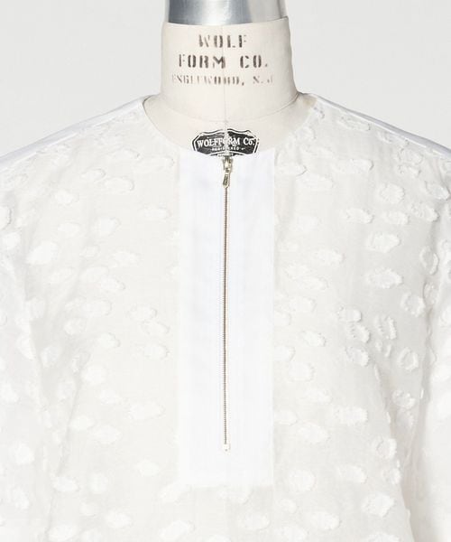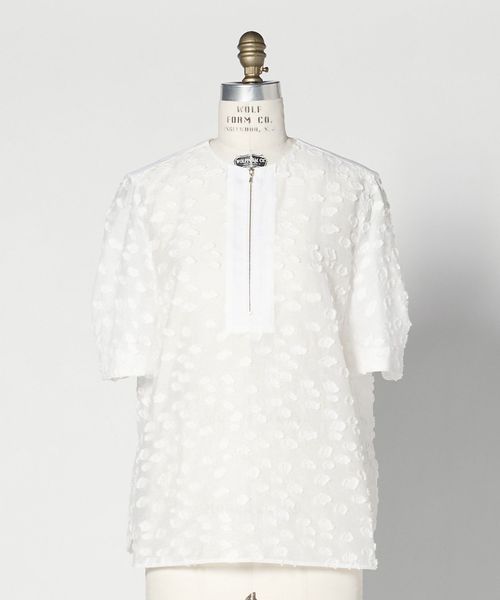 フロントのブザムとファスナーを組み合わせたデザインが華やかなショートパフスリーブブラウス。