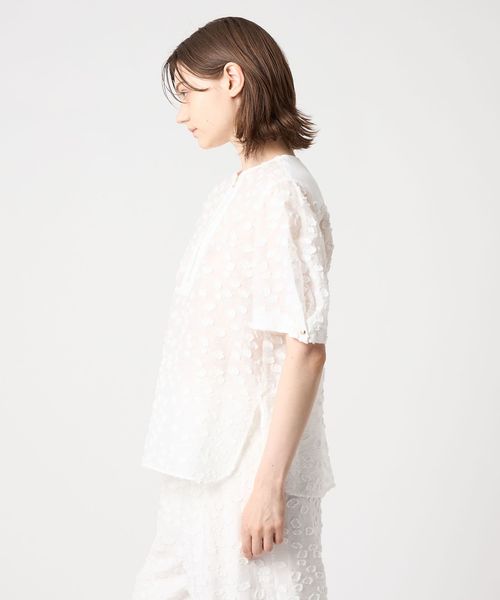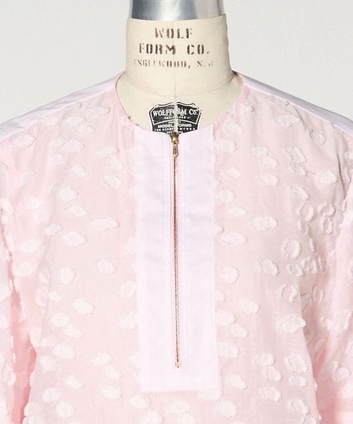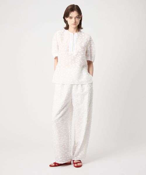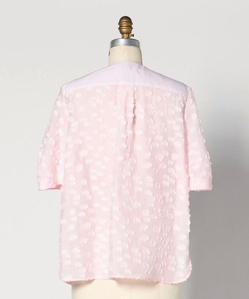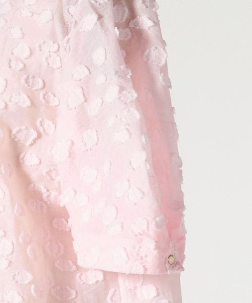 シアーベースにボタニカル柄のシャドウジャガードと変形ドットのカットジャガードを施したオリジナル素材。