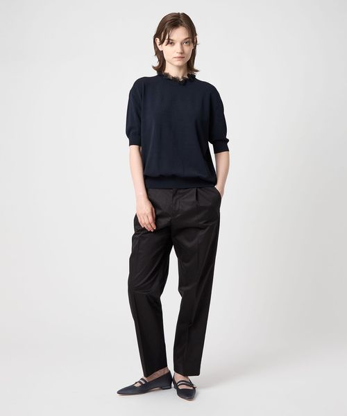 さらりとした手触りのレーヨンミックスの糸で編み立てたニット素材。