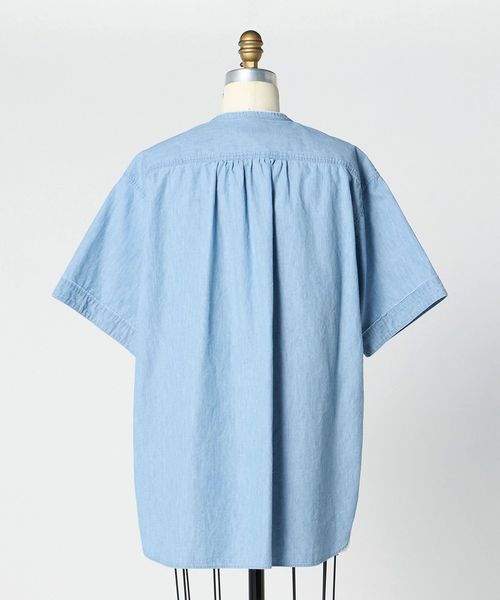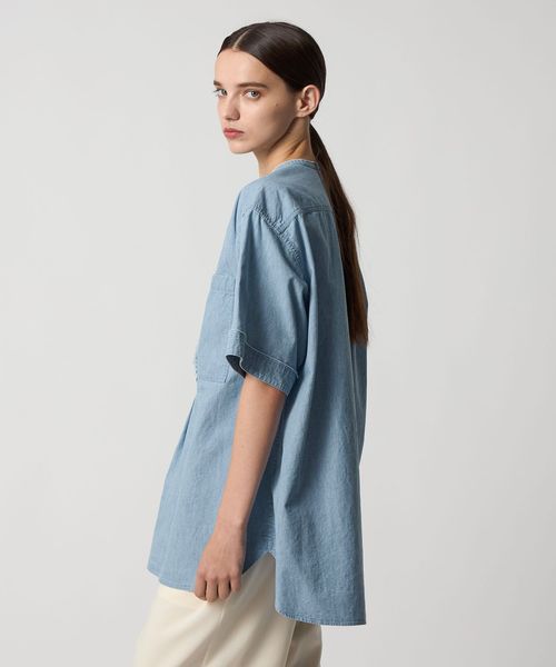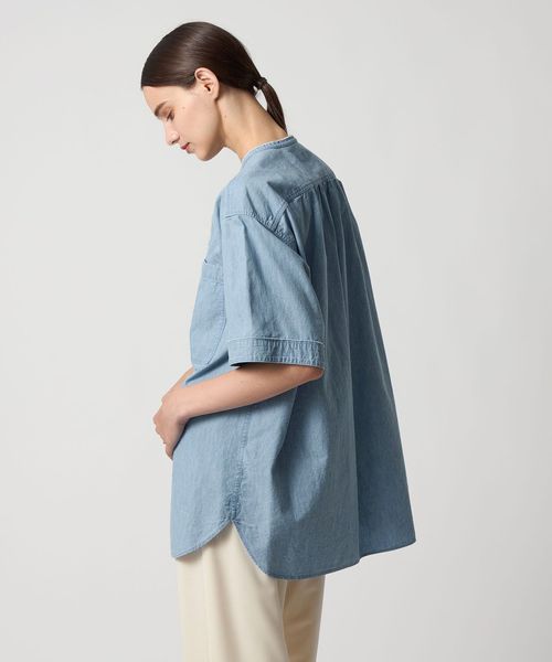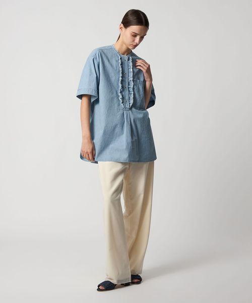 カジュアルなシャンブレーシャツをベースにほどよくフェミニンなディティールを加えたブラウス。