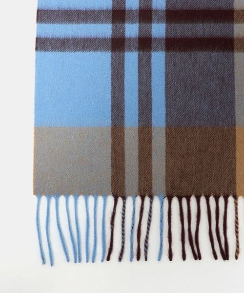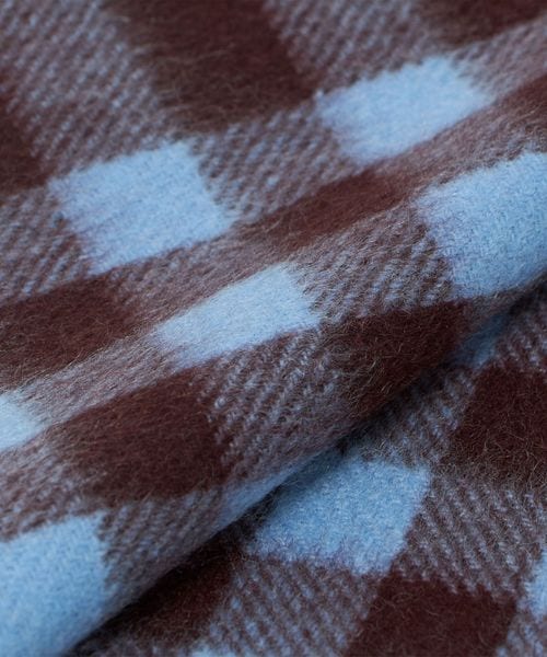 クールなブルーに温かみのあるブラウンカラーが効いたチェック柄が特徴のストール。
