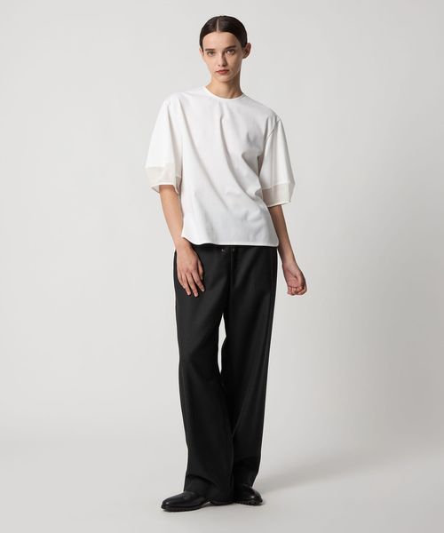 きれいめな生地感ながらも、センタープレスなし、裏地のない仕様でリラックス感があります。