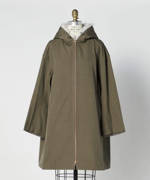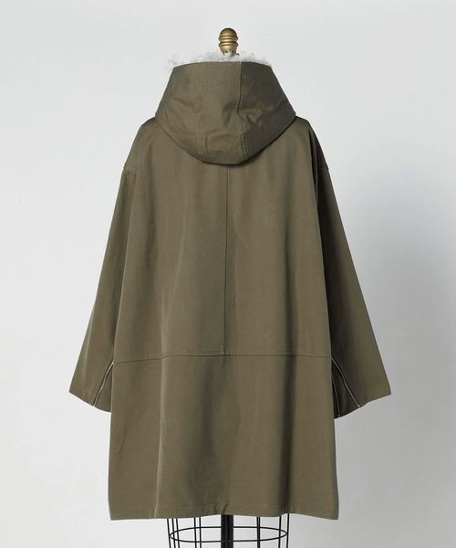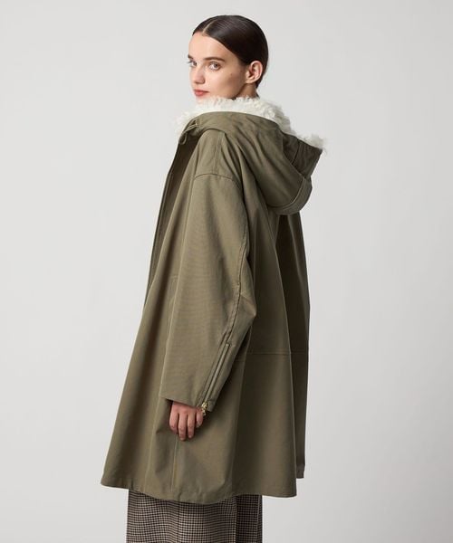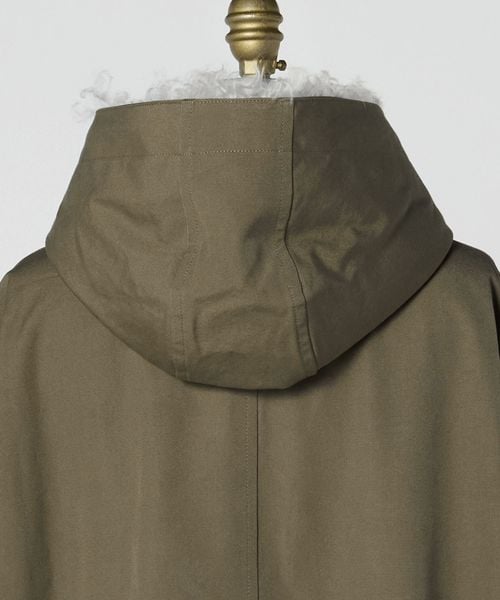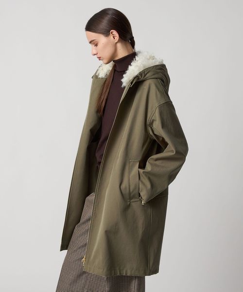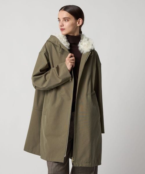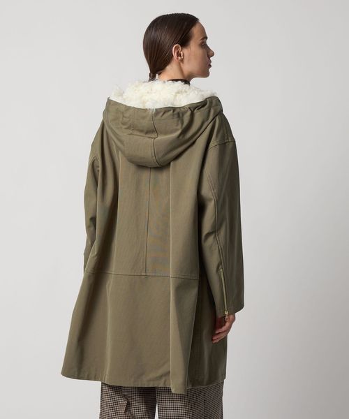 ふわりとしたムートンフードがアクセントになるモッズコート