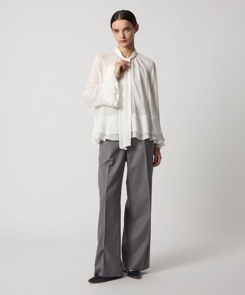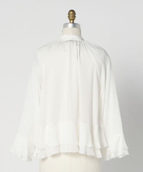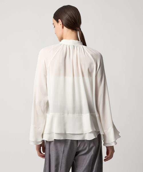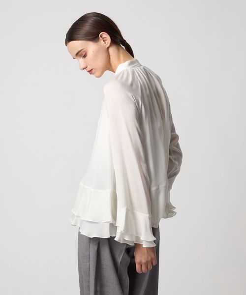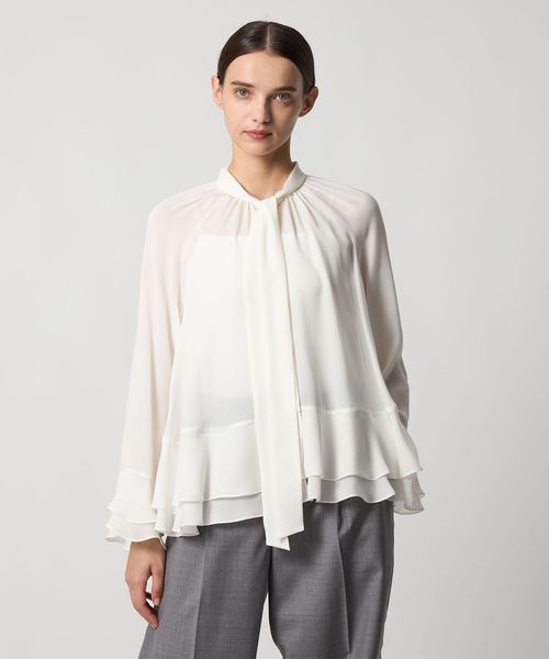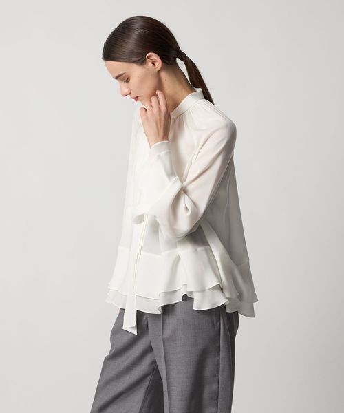 袖口と裾にあしらったティアードがさりげない華やぎを添えるブラウス。