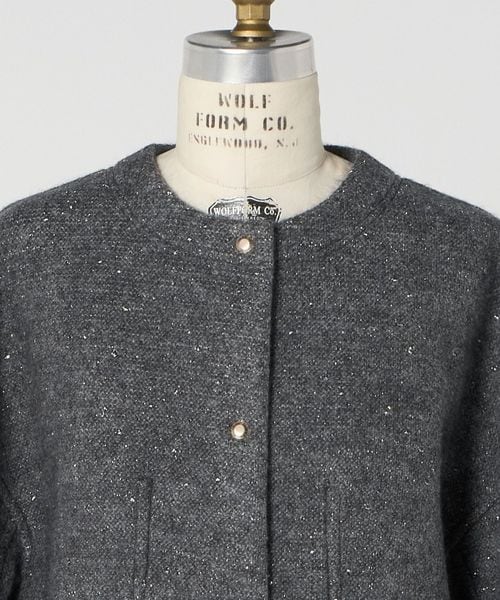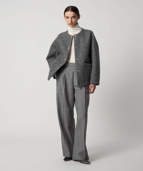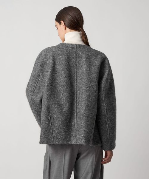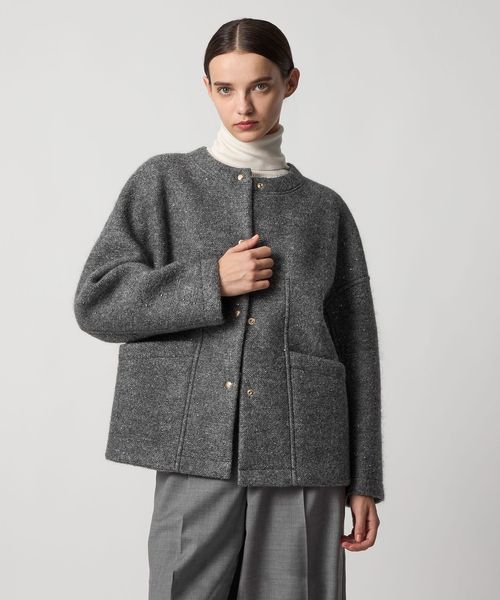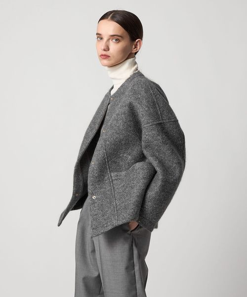 丸みのある立体フォルムが存在感をつくるノーカラージャケット