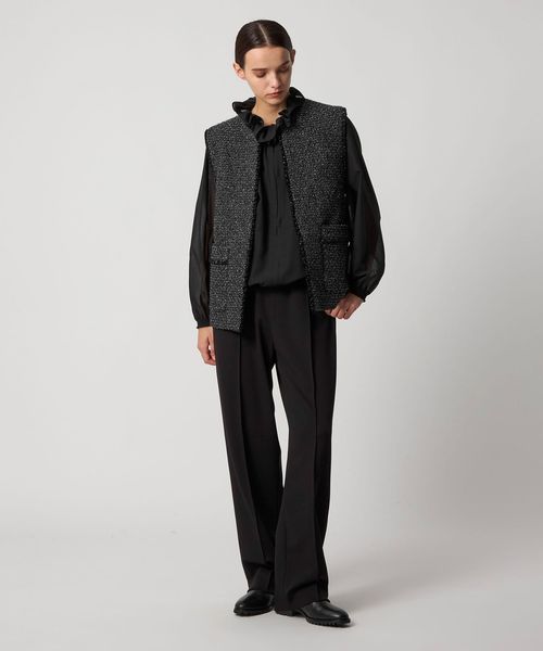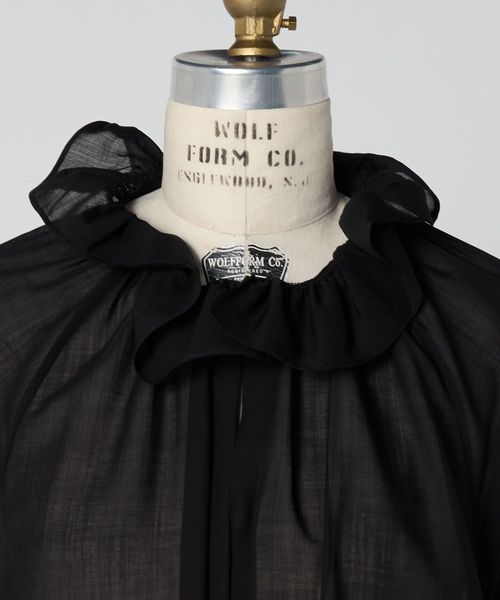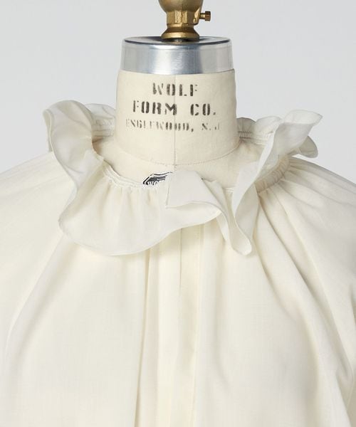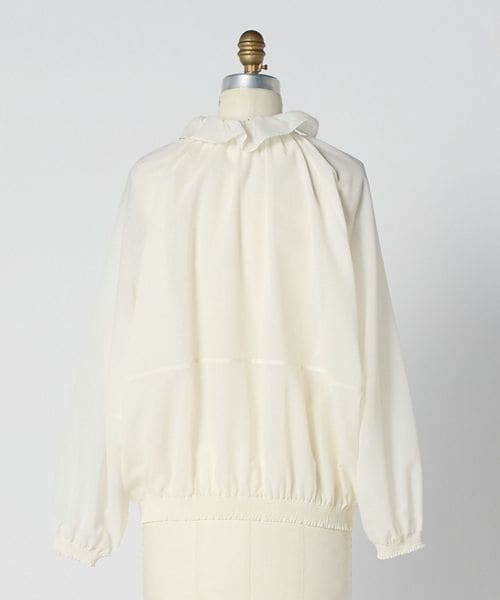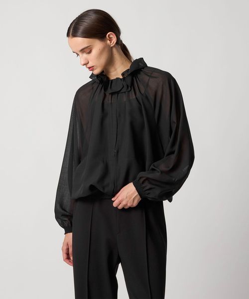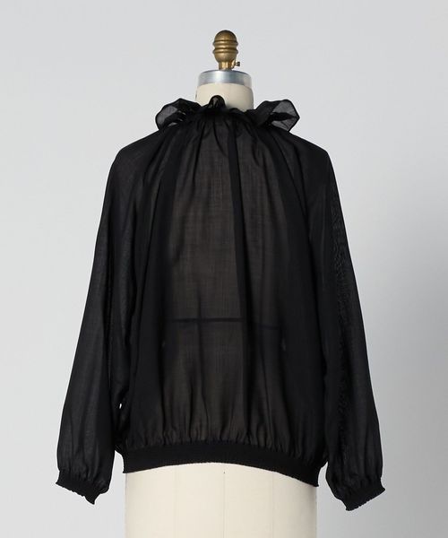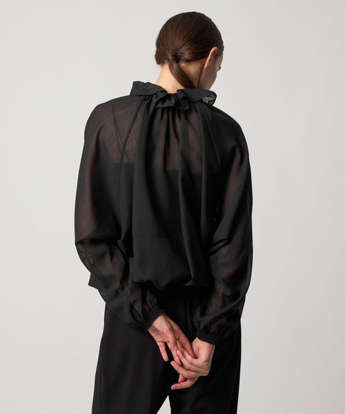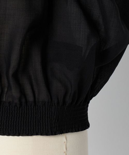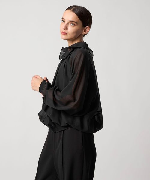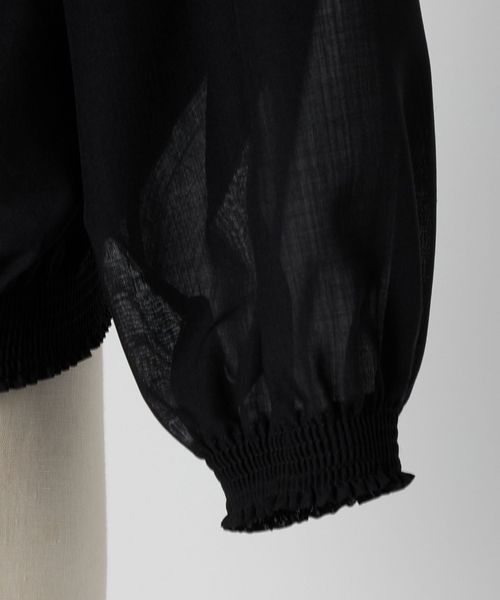 衿ぐり、袖口、裾にリブのような見え感のシャーリング加工を施し、さりげない立体感とエレガンスを演出したブラウス。