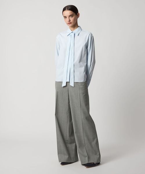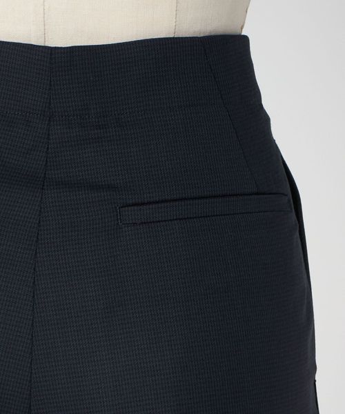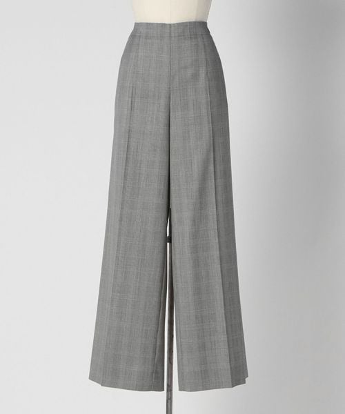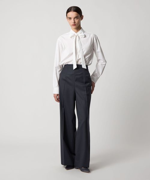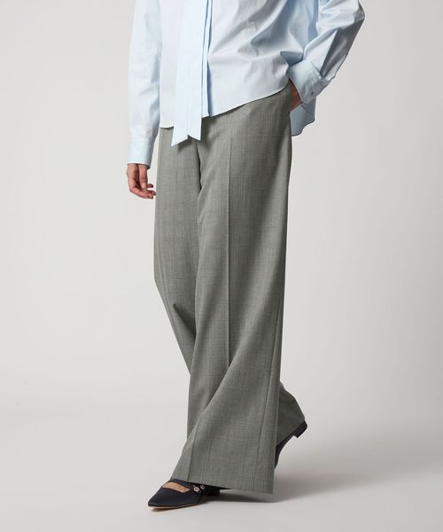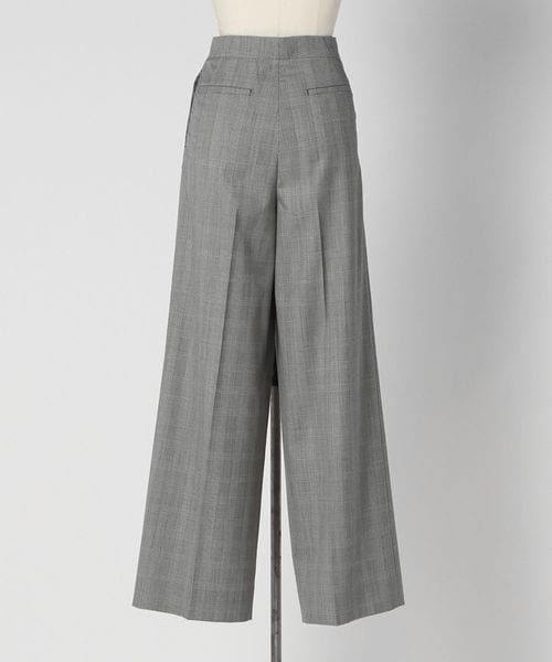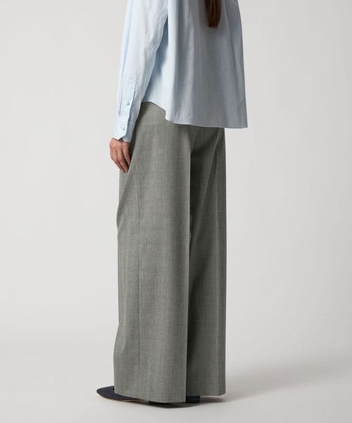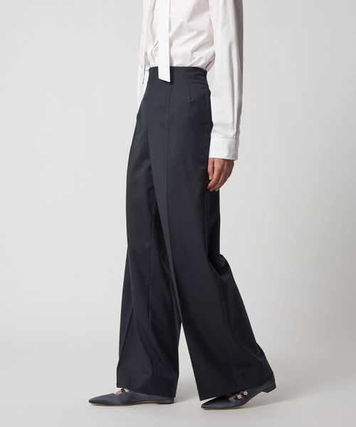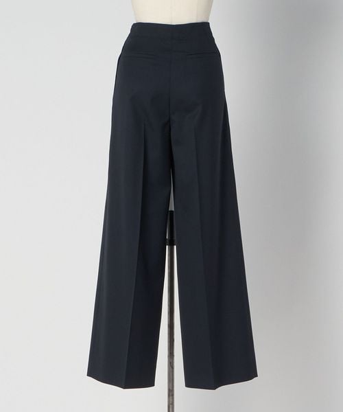 メンズライクな生地を使用し、あえてハイライズに仕立てることで女性らしいメリハリのある腰回りを美しく引き立てたワイドパンツ。