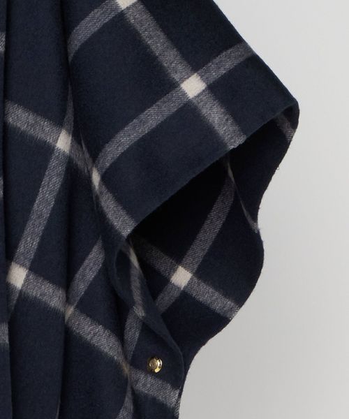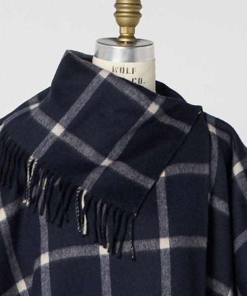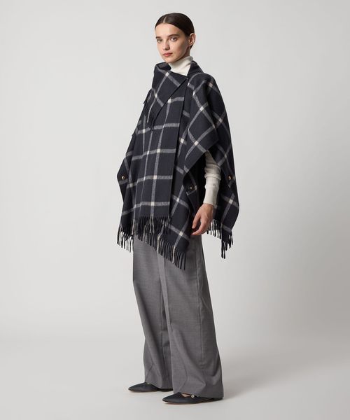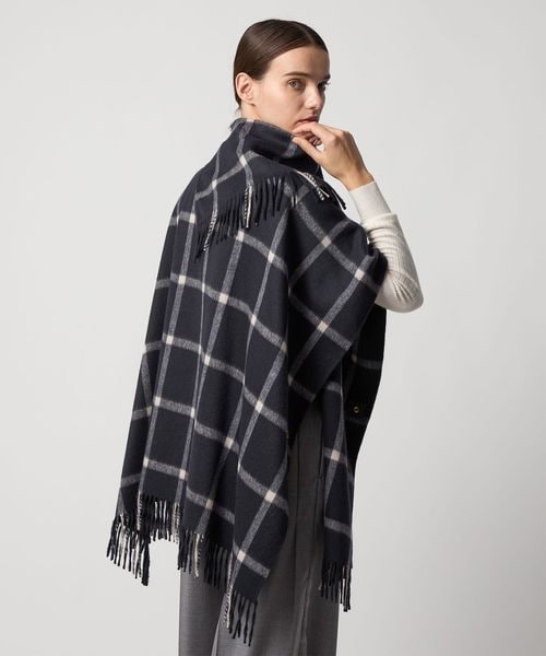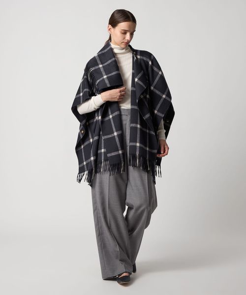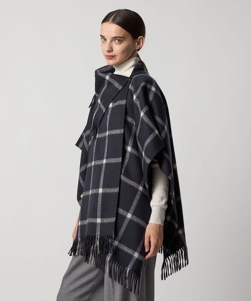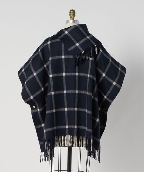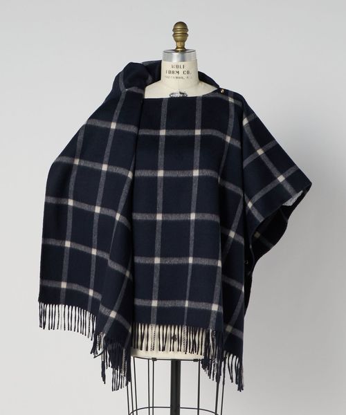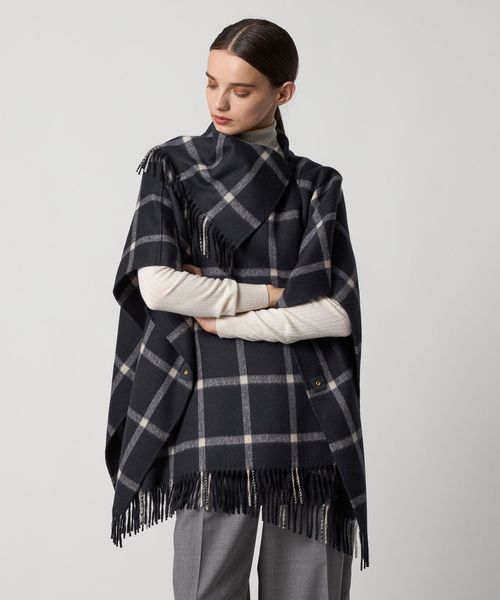 大胆なウィンドペン柄とフリンジ使いがクラシカルな雰囲気を漂わせるポンチョアウター。