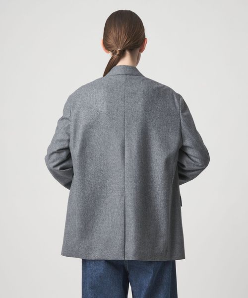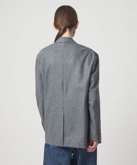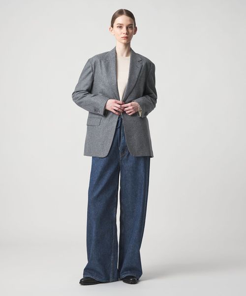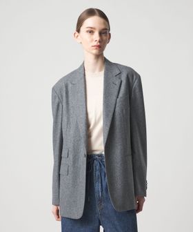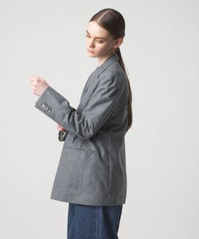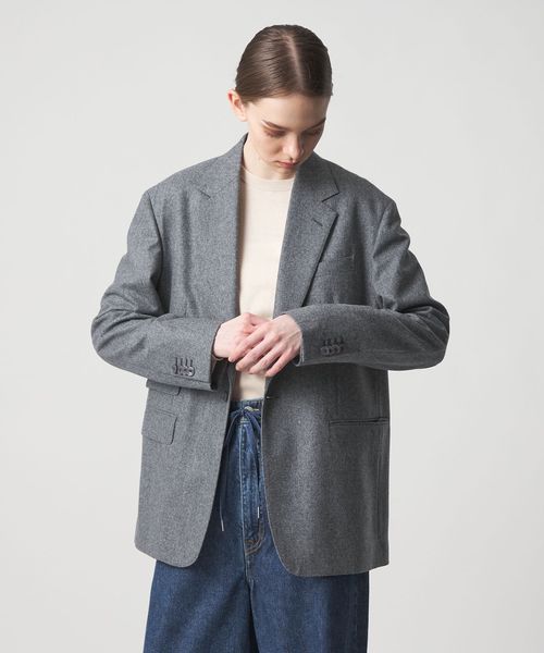 大きめなサイジングのボックスシルエットとシャープな細めラペルがモダンな印象を演出するテーラードジャケット。