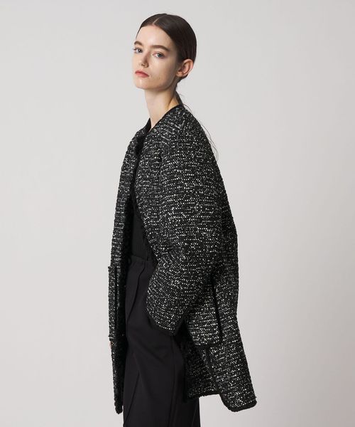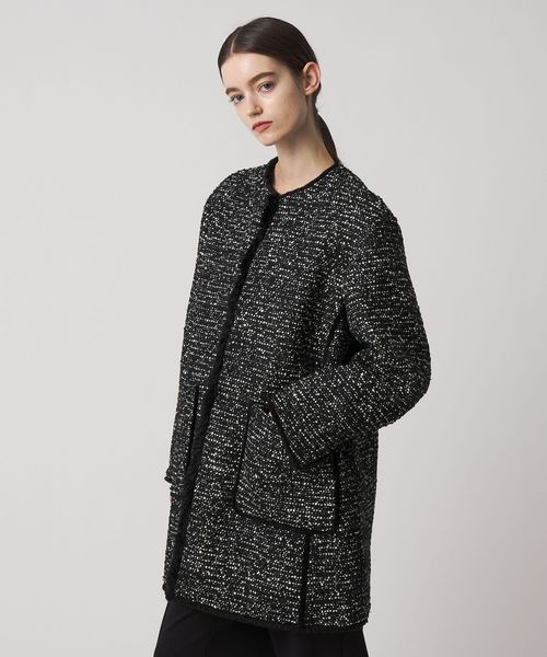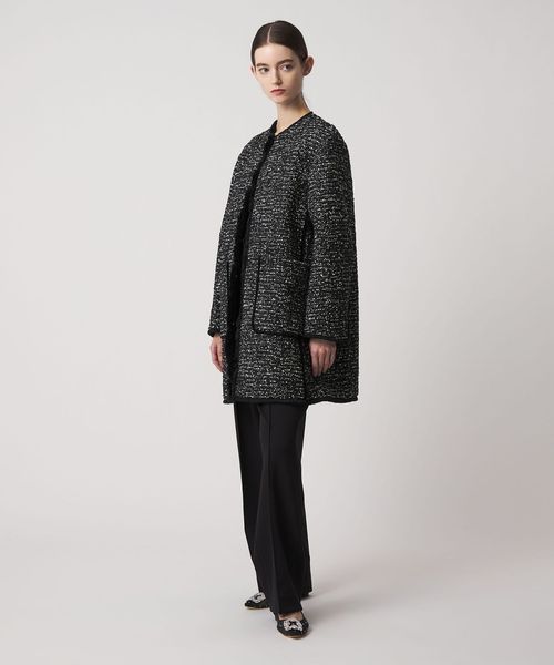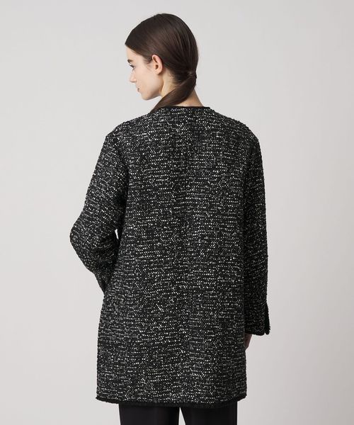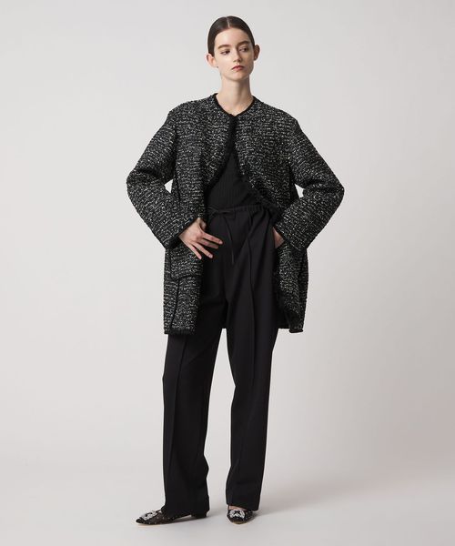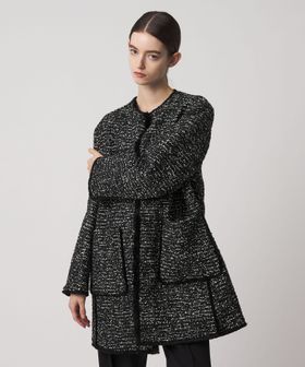 華やかなフリンジ使いが目を惹くノーカラーコート。